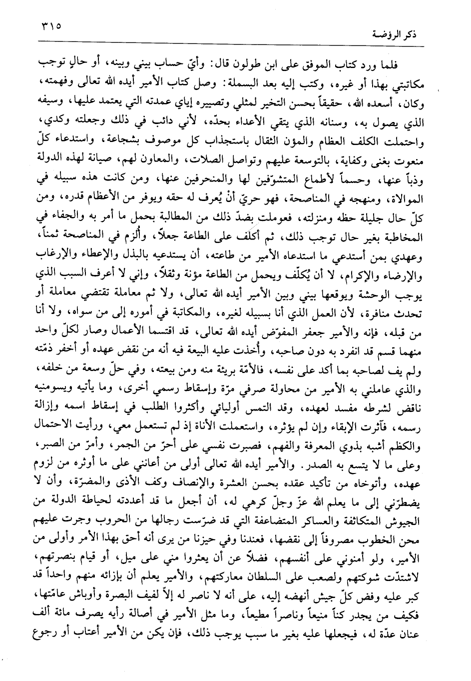 فلما ورد كتاب الموفق على ابن طولون قال: وأيّ حساب بيني وبينه، أو حال توجب مكاتبتي بهذا أو غيره، وكتب إليه بعد البسملة: وصل كتاب الأمير أيده الله تعالى وفهمته، وكان، أسعده الله، حقيقا بحسن التخير لمثلي وتصييره إياي عمدته التي يعتمد عليها، وسيفه الذي يصول به، وسنانه الذي يتقي الأعداء بحدّه، لأني دائب في ذلك وجعلته وكدي، واحتملت الكلف العظام والمؤن الثقال باستجذاب كل موصوف بشجاعة، واستدعاء كلّ منعوت بغنى وكفاية، بالتوسعة عليهم وتواصل الصلات، والمعاون لهم، صيانة لهذه الدولة وذبا عنها، وحسما لأطماع المتشوّفين لها والمنحرفين عنها، ومن كانت هذه سبيله في الموالاة، ومنهجه في المناصحة، فهو حريّ أن يعرف له حقه ويوفر من الإعظام قدره، ومن كلّ حال جليلة حظه ومنزلته، فعو ملت بضدّ ذلك من المطالبة بحمل ما أمر به والجفاء في المخاطبة بغير حال توجب ذلك، ثم أكلف على الطاعة جعلا، وألزم في المناصحة ثمنا، وعهدي بمن أستدعي ما استدعاه الأمير من طاعته، أن يستدعيه بالبذل والإعطاء والإرغاب والإرضاء والإكرام، لا أن يكلّف ويحمل من الطاعة مؤنة وثقلا، وإني لا أعرف السبب الذي يوجب الوحشة ويوقعها بيني وبين الأمير أيده الله تعالى، ولا ثم معاملة تقتضي معاملة أو تحدث منافرة، لأن العمل الذي أنا بسبيله لغيره، والمكاتبة في أموره إلى من سواه، ولا أنا من قبله، فإنه والأمير جعفر المفوّض أيده الله تعالى، قد اقتسما الأعمال وصار لكلّ واحد منهما قسم قد انفرد به دون صاحبه، وأخذت عليه البيعة فيه أنه من نقض عهده أو أخفر ذمّته ولم يف لصاحبه بما أكد على نفسه، فالأمّة بريئة منه ومن بيعته، وفي حلّ وسعة من خلفه، والذي عاملني به الأمير من محاولة صرفي مرّة وإسقاط رسمي أخرى، وما يأتيه ويسومنيه ناقض لشرطه مفسد لعهده، وقد التمس أوليائي وأكثروا الطلب في إسقاط اسمه وإزالة رسمه، فآثرت الإبقاء وإن لم يؤثره، واستعملت الأناة إذ لم تستعمل معي، ورأيت الاحتمال والكظم أشبه بذوي المعرفة والفهم، فصبرت نفسي على أحرّ من الجمر، وأمرّ من الصبر، وعلى ما لا يتسع به الصدر. والأمير أيده الله تعالى أولى من أعانني على ما أوثره من لزوم عهده، وأتوخاه من تأكيد عقده بحسن العشرة والإنصاف وكف الأذى والمضرّة، وأن لا يضطرّني إلى ما يعلم الله عزّ وجلّ كرهي له، أن أجعل ما قد أعددته لحياطة الدولة من الجيوش المتكاثفة والعساكر المتضاعفة التي قد ضرّست رجالها من الحروب وجرت عليهم محن الخطوب مصر وفا إلى نقضها، فعندنا وفي حيزنا من يرى أنه أحق بهذا الأمر وأولى من الأمير، ولو أمنوني على أنفسهم، فضلا عن أن يعثروا مني على ميل، أو قيام بنصرتهم، لاشتدّت شوكتهم ولصعب على السلطان معاركتهم، والأمير يعلم أن بإزائه منهم واحدا قد كبر عليه وفض كلّ جيش أنهضه إليه، على أنه لا ناصر له إلّا لفيف البصرة وأوباش عامّتها، فكيف من يجدر كنا منيعا وناصرا مطيعا، وما مثل الأمير في أصالة رأيه يصرف مائة ألف عنان عدّة له، فيجعلها عليه بغير ما سبب يوجب ذلك، فإن يكن من الأمير أعتاب أو رجوع