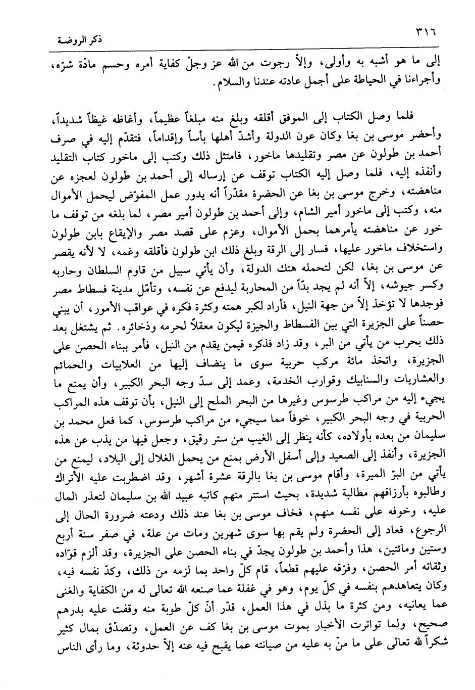 فلما وصل الكتاب إلى الموفق أقلقه وبلغ منه مبلغا عظيما، وأغاظه غيظا شديدا، وأحضر موسى بن بغا وكان عون الدولة وأشدّ أهلها بأسا وإقداما، فتقدّم إليه في صرف أحمد بن طولون عن مصر وتقليدها ماخور، فامتثل ذلك وكتب إلى ماخور كتاب التقليد وأنفذه إليه، فلما وصل إليه الكتاب توقف عن إرساله إلى أحمد بن طولون لعجزه عن مناهضته، وخرج موسى بن بغا عن الحضرة مقدّرا أنه يدور عمل المفوّض ليحمل الأموال منه، وكتب إلى ماخور أمير الشام، وإلى أحمد بن طولون أمير مصر، لما بلغه من توقف ما خور عن مناهضته يأمرهما بحمل الأموال، وعزم على قصد مصر والإيقاع بابن طولون واستخلاف ماخور عليها، فسار إلى الرقة وبلغ ذلك ابن طولون فأقلقه وغمه، لا لأنه يقصر عن موسى بن بغا، لكن لتحمله هتك الدولة، وأن يأتي سبيل من قاوم السلطان وحاربه وكسر جيوشه، إلّا أنه لم يجد بدّا من المحاربة ليدفع عن نفسه، وتأمّل مدينة فسطاط مصر فوجدها لا تؤخذ إلّا من جهة النيل، فأراد لكبر همته وكثرة فكره في عواقب الأمور، أن يبني حصنا على الجزيرة التي بين الفسطاط والجيزة ليكون معقلا لحرمه وذخائره. ثم يشتغل بعد ذلك بحرب من يأتي من البر، وقد زاد فذكره فيمن يقدم من النيل، فأمر ببناء الحصن على الجزيرة، واتخذ مائة مركب حربية سوى ما ينضاف إليها من العلابيات والحمائم والعشاريات والسنابيك وقوارب الخدمة، وعمد إلى سدّ وجه البحر الكبير، وأن يمنع ما يجيء إليه من مراكب طرسوس وغيرها من البحر الملح إلى النيل، بأن توقف هذه المراكب الحربية في وجه البحر الكبير، خوفا مما سيجيء من مراكب طرسوس، كما فعل محمد بن سليمان من بعده بأولاده، كأنه ينظر إلى الغيب من ستر رقيق، وجعل فيها من يذب عن هذه الجزيرة، وأنفذ إلى الصعيد وإلى أسفل الأرض بمنع من يحمل الغلال إلى البلاد، ليمنع من يأتي من البرّ الميرة، وأقام موسى بن بغا بالرقة عشرة أشهر، وقد اضطربت عليه الأتراك وطالبوه بأرزاقهم مطالبة شديدة، بحيث استتر منهم كاتبه عبيد الله بن سليمان لتعذر المال عليه، وخوفه على نفسه منهم، فخاف موسى بن بغا عند ذلك ودعته ضرورة الحال إلى الرجوع، فعاد إلى الحضرة ولم يقم بها سوى شهرين ومات من علة، في صفر سنة أربع وستين ومائتين، هذا وأحمد بن طولون يجدّ في بناء الحصن على الجزيرة، وقد ألزم قوّاده وثقاته أمر الحصن، وفرّقه عليهم قطعا، قام كلّ واحد بما لزمه من ذلك، وكدّ نفسه فيه، وكان يتعاهدهم بنفسه في كلّ يوم، وهو في غفلة عما صنعه الله تعالى له من الكفاية والغنى عما يعانيه، ومن كثرة ما بذل في هذا العمل، قدّر أنّ كلّ طوبة منه وقفت عليه بدرهم صحيح، ولما تواترت الأخبار بموت موسى بن بغا كف عن العمل، وتصدّق بمال كثير شكرا لله تعالى على ما منّ به عليه من صيانته عما يقبح فيه عنه إلّا حدوثة، وما رأى الناس