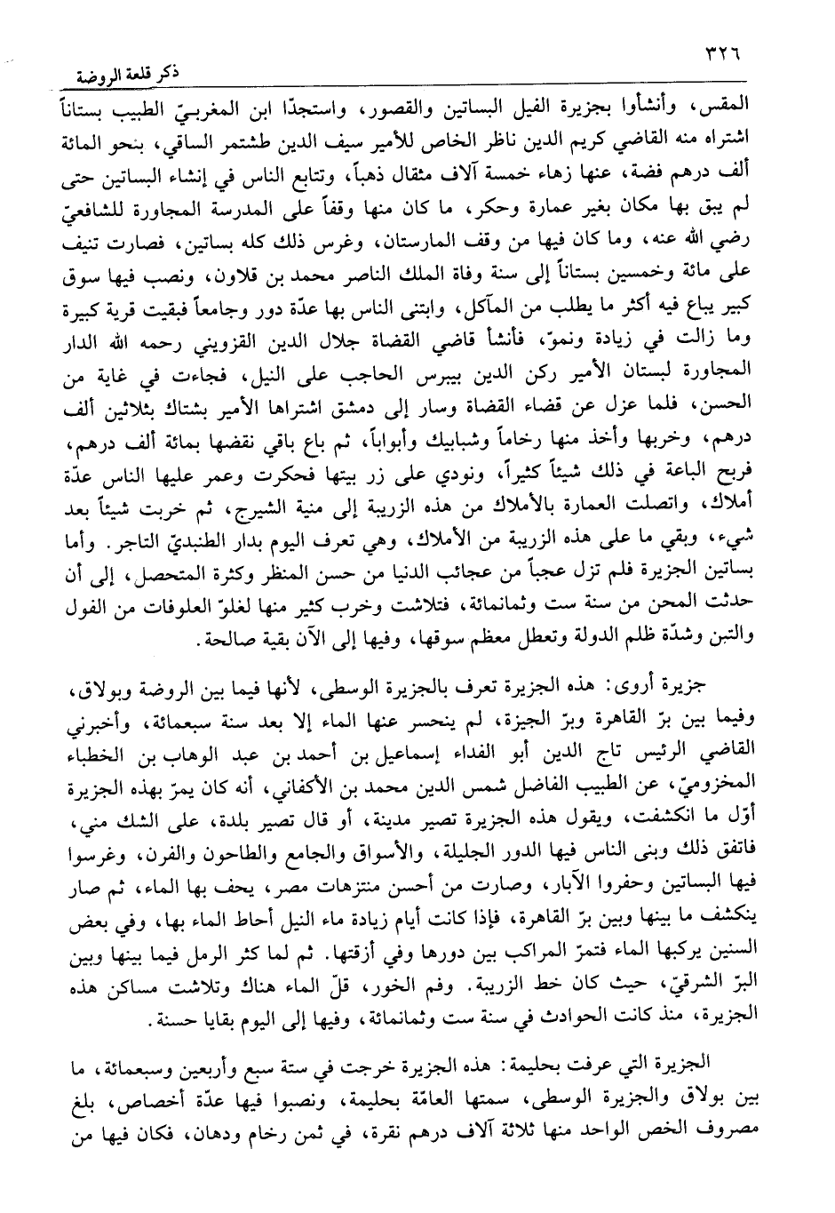 المقس، وأنشأوا بجزيرة الفيل البساتين والقصور، واستجدّا ابن المغربيّ الطبيب بستانا اشتراه منه القاضي كريم الدين ناظر الخاص للأمير سيف الدين طشتمر الساقي، بنحو المائة ألف درهم فضة، عنها زهاء خمسة آلاف مثقال ذهبا، وتتابع الناس في إنشاء البساتين حتى لم يبق بها مكان بغير عمارة وحكر، ما كان منها وقفا على المدرسة المجاورة للشافعيّ رضي الله عنه، وما كان فيها من وقف المارستان، وغرس ذلك كله بساتين، فصارت تنيف على مائة وخمسين بستانا إلى سنة وفاة الملك الناصر محمد بن قلاون، ونصب فيها سوق كبير يباع فيه أكثر ما يطلب من المآكل، وابتنى الناس بها عدّة دور وجامعا فبقيت قرية كبيرة وما زالت في زيادة ونموّ، فأنشأ قاضي القضاة جلال الدين القزويني رحمه الله الدار المجاورة لبستان الأمير ركن الدين بيبرس الحاجب على النيل، فجاءت في غاية من الحسن، فلما عزل عن قضاء القضاة وسار إلى دمشق اشتراها الأمير بشتاك بثلاثين ألف درهم، وخربها وأخذ منها رخاما وشبابيك وأبوابا، ثم باع باقي نقضها بمائة ألف درهم، فربح الباعة في ذلك شيئا كثيرا، ونودي على زر بيتها فحكرت وعمر عليها الناس عدّة أملاك، واتصلت العمارة بالأملاك من هذه الزريبة إلى منية الشيرج، ثم خربت شيئا بعد شيء، وبقي ما على هذه الزريبة من الأملاك، وهي تعرف اليوم بدار الطنبديّ التاجر. وأما بساتين الجزيرة فلم تزل عجبا من عجائب الدنيا من حسن المنظر وكثرة المتحصل، إلى أن حدثت المحن من سنة ست وثمانمائة، فتلاشت وخرب كثير منها لغلوّ العلوفات من الفول والتبن وشدّة ظلم الدولة وتعطل معظم سوقها، وفيها إلى الآن بقية صالحة.