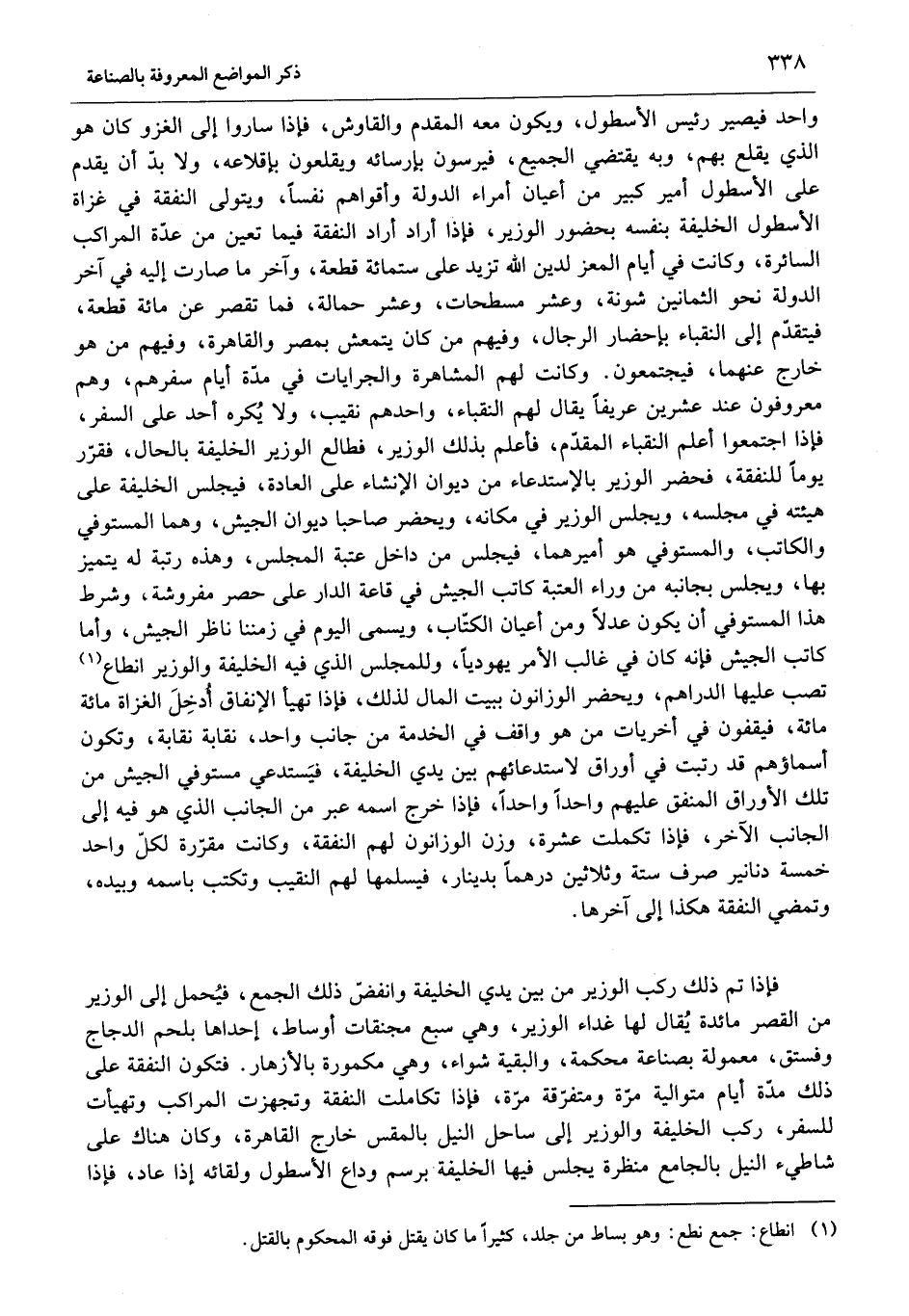 واحد فيصير رئيس الأسطول، ويكون معه المقدم والقاوش، فإذا ساروا إلى الغزو كان هو الذي يقلع بهم، وبه يقتضي الجميع، فيرسون بإرسائه ويقلعون بإقلاعه، ولا بدّ أن يقدم على الأسطول أمير كبير من أعيان أمراء الدولة وأقواهم نفسا، ويتولى النفقة في غزاة الأسطول الخليفة بنفسه بحضور الوزير، فإذا أراد أراد النفقة فيما تعين من عدّة المراكب السائرة، وكانت في أيام المعز لدين الله تزيد على ستمائة قطعة، وآخر ما صارت إليه في آخر الدولة نحو الثمانين شونة، وعشر مسطحات، وعشر حمالة، فما تقصر عن مائة قطعة، فيتقدّم إلى النقباء بإحضار الرجال، وفيهم من كان يتمعش بمصر والقاهرة، وفيهم من هو خارج عنهما، فيجتمعون. وكانت لهم المشاهرة والجرايات في مدّة أيام سفرهم، وهم معروفون عند عشرين عريفا يقال لهم النقباء، واحدهم نقيب، ولا يكره أحد على السفر، فإذا اجتمعوا أعلم النقباء المقدّم، فأعلم بذلك الوزير، فطالع الوزير الخليفة بالحال، فقرّر يوما للنفقة، فحضر الوزير بالاستدعاء من ديوان الإنشاء على العادة، فيجلس الخليفة على هيئته في مجلسه، ويجلس الوزير في مكانه، ويحضر صاحبا ديوان الجيش، وهما المستوفي والكاتب، والمستوفي هو أمير هما، فيجلس من داخل عتبة المجلس، وهذه رتبة له يتميز بها، ويجلس بجانبه من وراء العتبة كاتب الجيش في قاعة الدار على حصر مفروشة، وشرط هذا المستوفي أن يكون عدلا ومن أعيان الكتّاب، ويسمى اليوم في زمننا ناظر الجيش، وأما كاتب الجيش فإنه كان في غالب الأمر يهوديا، وللمجلس الذي فيه الخليفة والوزير انطاع «1» تصب عليها الدراهم، ويحضر الوزانون ببيت المال لذلك، فإذا تهيأ الإنفاق أدخل الغزاة مائة مائة، فيقفون في أخريات من هو واقف في الخدمة من جانب واحد، نقابة نقابة، وتكون أسماؤهم قد رتبت في أوراق لاستدعائهم بين يدي الخليفة، فيستدعي مستوفي الجيش من تلك الأوراق المنفق عليهم واحدا واحدا، فإذا خرج اسمه عبر من الجانب الذي هو فيه إلى الجانب الآخر، فإذا تكملت عشرة، وزن الوزانون لهم النفقة، وكانت مقرّرة لكلّ واحد خمسة دنانير صرف ستة وثلاثين درهما بدينار، فيسلمها لهم النقيب وتكتب باسمه وبيده، وتمضي النفقة هكذا إلى آخرها.