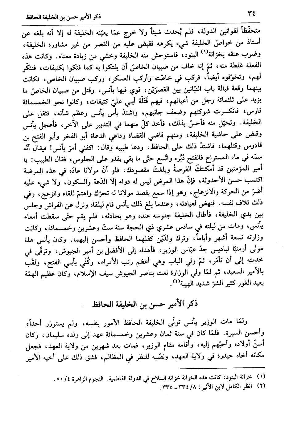 متحفّظا لقوانين الدولة، فلم يحدث شيئا ولا خرج عمّا يعيّنه الخليفة له إلا أنه بلغه عن أستاذ من خواصّ الخليفة شيء يكرهه فقبض عليه من القصر من غير مشاورة الخليفة، وضرب عنقه بخزانة «1» البنود، فاستوحش منه الخليفة وخشي من زيادة معناه. وكانت هذه الفعلة غلطة منه، ثمّ إنه خاف من صبيان الخاصّ أن يفتكوا به كما فتكوا بكتيفات، فتنكّر لهم، وتخوّفوه أيضا، فركب في خاصّته وأركب العسكر، وركب صبيان الخاص، فكانت بينهما وقعة قبالة باب التبّانين بين القصرين، قوي فيها يأنس، وقتل من صبيان الخاصّ ما يزيد على ثلثمائة رجل من أعيانهم، فيهم قتلة أبي عليّ كتيفات، وكانوا نحو الخمسمائة فارس، فانكسرت شوكتهم وضعف جانبهم، واشتدّ بأس يأنس وعظم شأنه، فثقل على الخليفة. وتحيّل منه فأحسّ بذلك، فأخذ كلّ منهما في التدبير على الآخر، فأعجل يأنس وقبض على حاشية الخليفة، ومنهم قاضي القضاة وداعي الدعاة أبو الفخر وأبو الفتح بن قادوس وقتلهما، فاشتدّ ذلك على الحافظ، ودعا طبيبه وقال: اكفني أمر يأنس! فيقال أنّه سمّه في ماء المستراح فانفتح دبره واتّسع حتّى ما بقي يقدر على الجلوس، فقال الطبيب: يا أمير المؤمنين قد أمكنتك الفرصة وبلغت مقصودك، فلو أنّ مولانا عاده في هذه المرضة اكتسب حسن الأحدوثة، فإنّ هذا المرض ليس له دواء إلا الدّعة والسكون، ولا شيء عليه أضرّ من الحركة والانزعاج، وهو إذا سمع بقصد مولانا له تحرّك واهتمّ للقاء وانزعج، وفي ذلك تلاف نفسه. فنهض لعيادته، وعند ما بلغ ذلك يأنس قام ليلقاه ونزل عن الفراش وجلس بين يدي الخليفة، فأطال الخليفة جلوسه عنده وهو يحادثه، فلم يقم حتّى سقطت أمعاء يأنس، ومات من ليلته في سادس عشري ذي الحجة سنة ستّ وعشرين وخمسمائة، وكانت وزارته تسعة أشهر وأياما، وترك ولدين كفلهما الحافظ وأحسن إليهما. وكان يأنس هذا مولى أرمنيّا لباديس جدّ عبّاس الوزير، فأهداه إلى الأفضل بن أمير الجيوش، وترقّى في خدمته إلى أن تأمّر، ثمّ ولي الباب وهي أعظم رتب الأمراء، وكنّي بأبي الفتح، ولقّب بالأمير السعيد، ثم لمّا ولي الوزارة نعت بناصر الجيوش سيف الإسلام، وكان عظيم الهمّة بعيد الغور كثير الشرّ شديد الهيبة «2» .