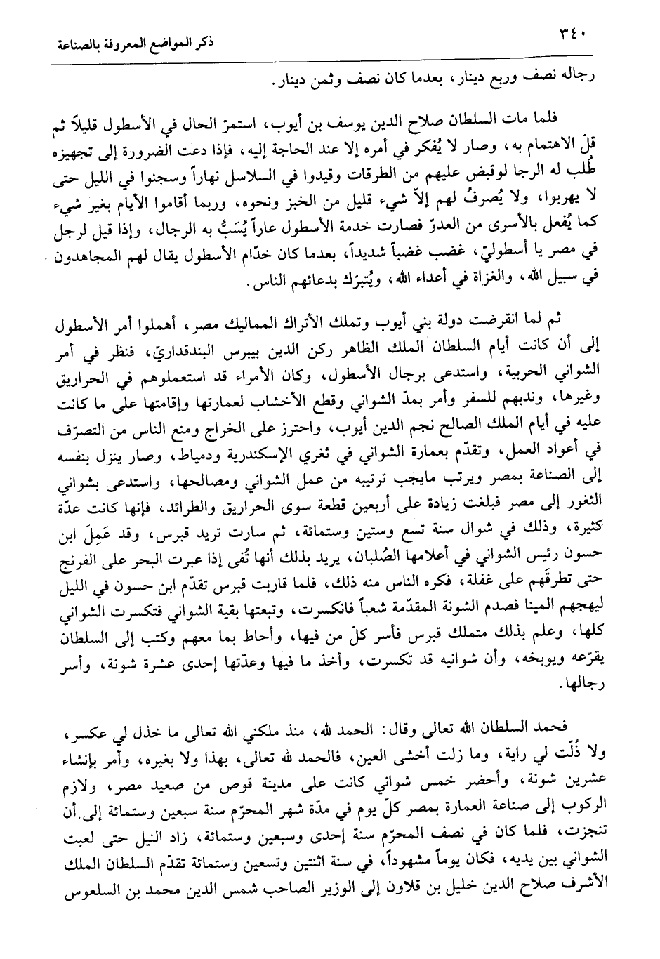 فحمد السلطان الله تعالى وقال: الحمد لله، منذ ملكني الله تعالى ما خذل لي عكسر، ولا ذلّت لي راية، وما زلت أخشى العين، فالحمد لله تعالى، بهذا ولا بغيره، وأمر بإنشاء عشرين شونة، وأحضر خمس شواني كانت على مدينة قوص من صعيد مصر، ولازم الركوب إلى صناعة العمارة بمصر كلّ يوم في مدّة شهر المحرّم سنة سبعين وستمائة إلى أن تنجزت، فلما كان في نصف المحرّم سنة إحدى وسبعين وستمائة، زاد النيل حتى لعبت الشواني بين يديه، فكان يوما مشهودا، في سنة اثنتين وتسعين وستمائة تقدّم السلطان الملك الأشرف صلاح الدين خليل بن قلاون إلى الوزير الصاحب شمس الدين محمد بن السلعوس