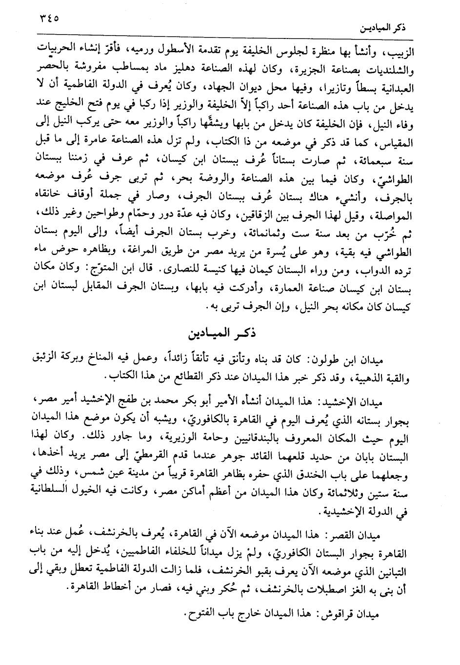 ميدان ابن طولون: كان قد بناه وتأنق فيه تأنقا زائدا، وعمل فيه المناخ وبركة الزئبق والقبة الذهبية، وقد ذكر خبر هذا الميدان عند ذكر القطائع من هذا الكتاب.