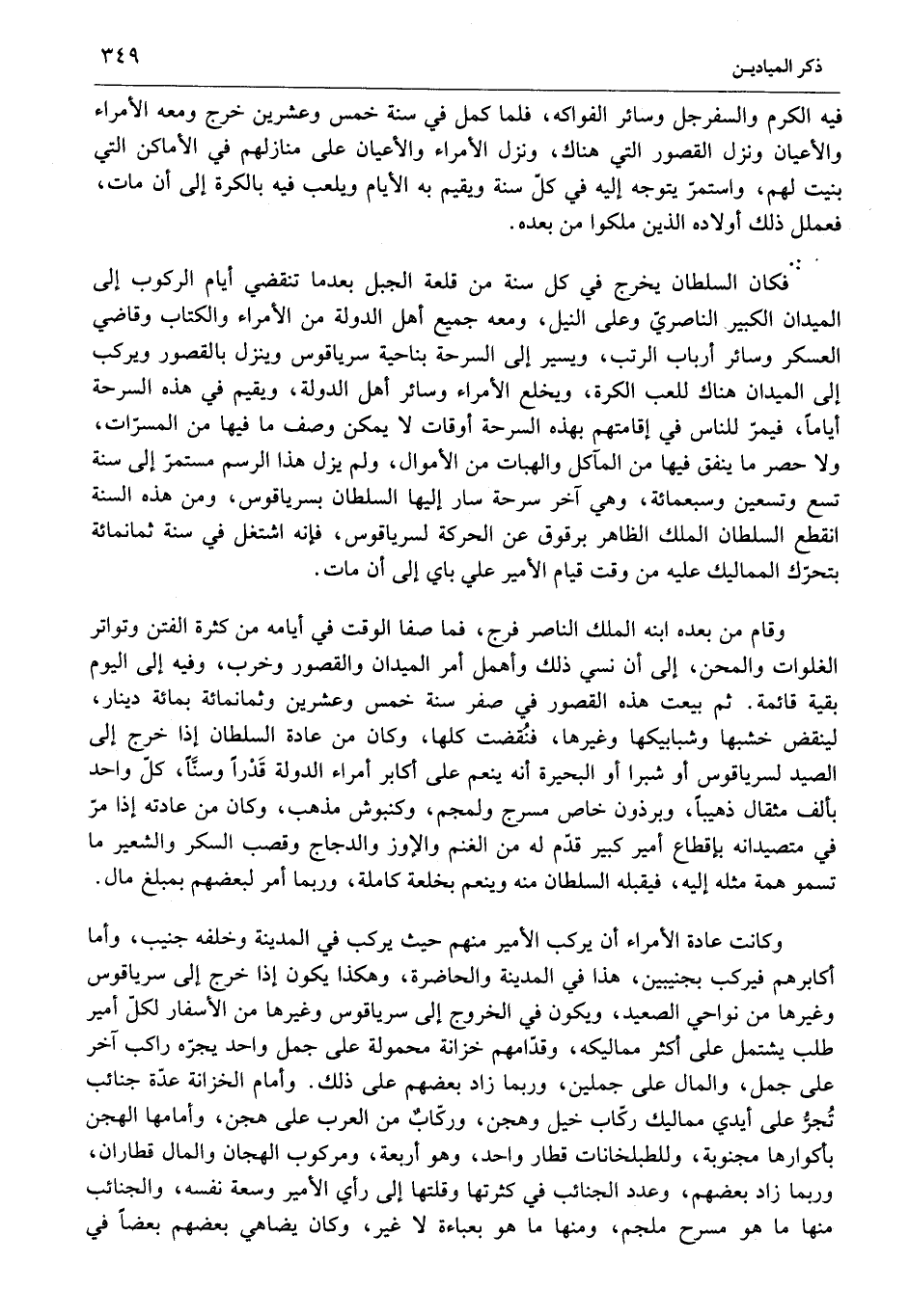 فكان السلطان يخرج في كل سنة من قلعة الجبل بعد ما تنقضي أيام الركوب إلى الميدان الكبير الناصريّ وعلى النيل، ومعه جميع أهل الدولة من الأمراء والكتاب وقاضي العسكر وسائر أرباب الرتب، ويسير إلى السرحة بناحية سرياقوس وينزل بالقصور ويركب إلى الميدان هناك للعب الكرة، ويخلع الأمراء وسائر أهل الدولة، ويقيم في هذه السرحة أياما، فيمرّ للناس في إقامتهم بهذه السرحة أوقات لا يمكن وصف ما فيها من المسرّات، ولا حصر ما ينفق فيها من المآكل والهبات من الأموال، ولم يزل هذا الرسم مستمرّ إلى سنة تسع وتسعين وسبعمائة، وهي آخر سرحة سار إليها السلطان بسرياقوس، ومن هذه السنة انقطع السلطان الملك الظاهر برقوق عن الحركة لسرياقوس، فإنه اشتغل في سنة ثمانمائة بتحرّك المماليك عليه من وقت قيام الأمير علي باي إلى أن مات.