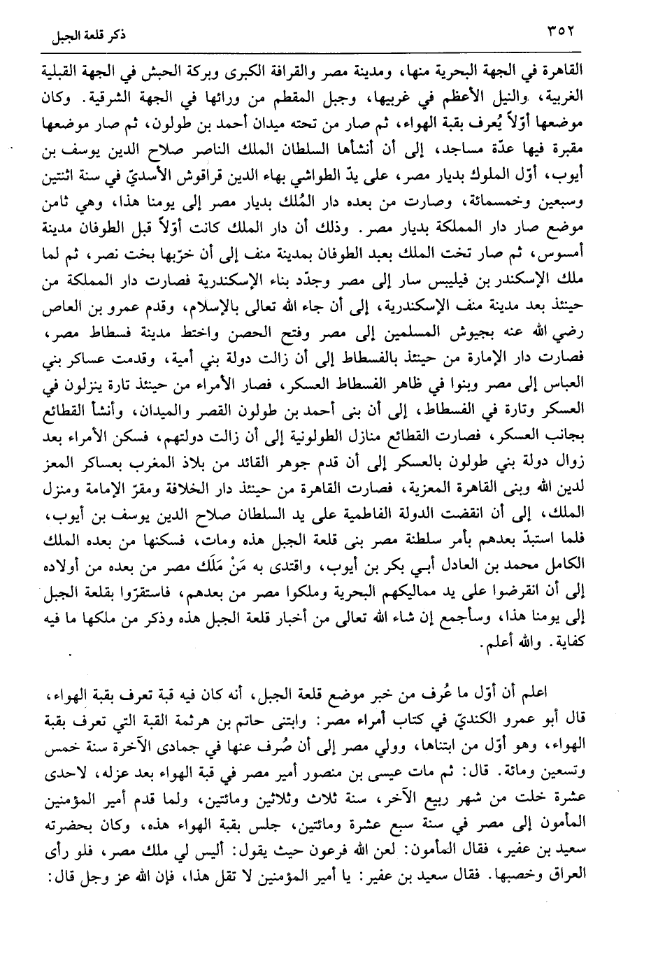 اعلم أن أوّل ما عرف من خبر موضع قلعة الجبل، أنه كان فيه قبة تعرف بقبة الهواء، قال أبو عمرو الكنديّ في كتاب أمراء مصر: وابتنى حاتم بن هرثمة القبة التي تعرف بقبة الهواء، وهو أوّل من ابتناها، وولي مصر إلى أن صرف عنها في جمادى الآخرة سنة خمس وتسعين ومائة. قال: ثم مات عيسى بن منصور أمير مصر في قبة الهواء بعد عزله، لاحدى عشرة خلت من شهر ربيع الآخر، سنة ثلاث وثلاثين ومائتين، ولما قدم أمير المؤمنين المأمون إلى مصر في سنة سبع عشرة ومائتين، جلس بقبة الهواء هذه، وكان بحضرته سعيد بن عفير، فقال المأمون: لعن الله فرعون حيث يقول: أليس لي ملك مصر، فلو رأى العراق وخصبها. فقال سعيد بن عفير: يا أمير المؤمنين لا تقل هذا، فإن الله عز وجل قال:
