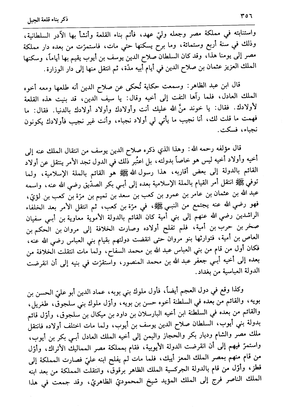 قال مؤلفه رحمه الله: وهذا الذي ذكره صلاح الدين يوسف من انتقال الملك عنه إلى أخيه وأولاد أخيه ليس هو خاصا بدولته، بل اعتبر ذلك في الدول تجد الأمر ينتقل عن أولاد القائم بالدولة إلى بعض أقاربه، هذا رسول الله صلى الله عليه وسلم هو القائم بالملة الإسلامية، ولما توفي صلى الله عليه وسلم انتقل أمر القيام بالملة الإسلامية بعده إلى أبي بكر الصدّيق رضي الله عنه، واسمه عبد الله بن عثمان بن عامر بن عمرو بن كعب بن سعد بن تميم بن مرّة بن كعب بن لؤيّ، فهو رضي الله عنه يجتمع من النبي صلى الله عليه وسلم، في مرّة بن كعب، ثم انتقل الأمر بعد الخلفاء الراشدين رضي الله عنهم إلى بني أمية كان القائم بالدولة الأموية معاوية بن أبي سفيان صخر بن حرب بن أمية، فلم تفلح أولاده وصارت الخلافة إلى مروان بن الحكم بن العاص بن أمية، فتوارثها بنو مروان حتى انقضت دولتهم بقيام بني العباس رضي الله عنه، فكان أول من قام من بني العباس عبد الله بن محمد السفاح، ولما مات انتقلت الخلافة من بعده إلى أخيه أبي جعفر عبد الله بن محمد المنصور، واستقرّت في بنيه إلى أن انقرضت الدولة العباسية من بغداد.
