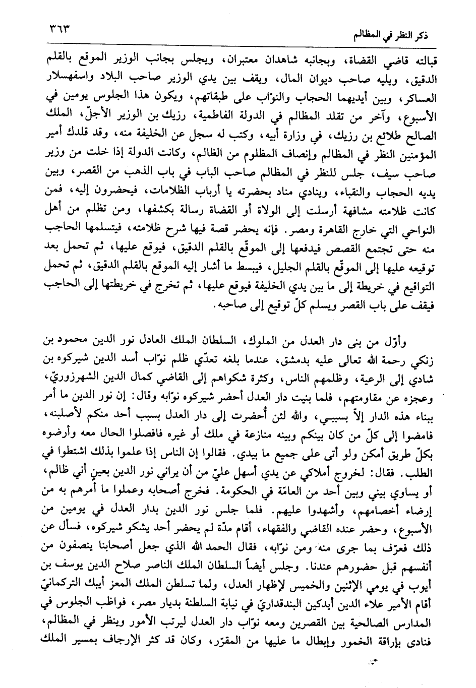 وأوّل من بنى دار العدل من الملوك، السلطان الملك العادل نور الدين محمود بن زنكي رحمة الله تعالى عليه بدمشق، عند ما بلغه تعدّي ظلم نوّاب أسد الدين شير كوه بن شادي إلى الرعية، وظلمهم الناس، وكثرة شكواهم إلى القاضي كمال الدين الشهرزوريّ، وعجزه عن مقاومتهم، فلما بنيت دار العدل أحضر شير كوه نوّابه وقال: إن نور الدين ما أمر ببناء هذه الدار إلّا بسببي، والله لئن أحضرت إلى دار العدل بسبب أحد منكم لأصلبنه، فامضوا إلى كلّ من كان بينكم وبينه منازعة في ملك أو غيره فافصلوا الحال معه وأرضوه بكلّ طريق أمكن ولو أتى على جميع ما بيدي. فقالوا إن الناس إذا علموا بذلك اشتطوا في الطلب. فقال: لخروج أملاكي عن يدي أسهل عليّ من أن يراني نور الدين بعين أني ظالم، أو يساوي بيني وبين أحد من العامّة في الحكومة. فخرج أصحابه وعملوا ما أمرهم به من إرضاء أخصامهم، وأشهدوا عليهم. فلما جلس نور الدين بدار العدل في يومين من الأسبوع، وحضر عنده القاضي والفقهاء، أقام مدّة لم يحضر أحد يشكو شير كوه، فسأل عن ذلك فعرّف بما جرى منه ومن نوّابه، فقال الحمد الله الذي جعل أصحابنا ينصفون من أنفسهم قبل حضورهم عندنا. وجلس أيضا السلطان الملك الناصر صلاح الدين يوسف بن أيوب في يومي الاثنين والخميس لإظهار العدل، ولما تسلطن الملك المعز أيبك التركمانيّ أقام الأمير علاء الدين أيدكين البندقداريّ في نيابة السلطنة بديار مصر، فواظب الجلوس في المدارس الصالحية بين القصرين ومعه نوّاب دار العدل ليرتب الأمور وينظر في المظالم، فنادى بإراقة الخمور وإبطال ما عليها من المقرّر، وكان قد كثر الإرجاف بمسير الملك