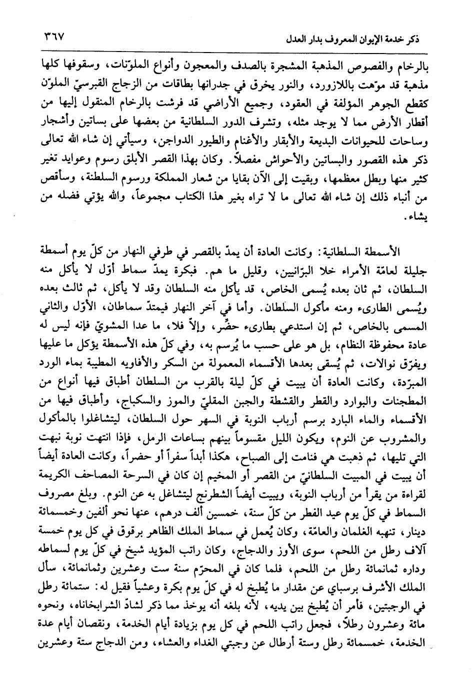 الأسمطة السلطانية: وكانت العادة أن يمدّ بالقصر في طرفي النهار من كلّ يوم أسمطة جليلة لعامّة الأمراء خلا البرّانيين، وقليل ما هم. فبكرة يمدّ سماط أوّل لا يأكل منه السلطان، ثم ثان بعده يسمى الخاص، قد يأكل منه السلطان وقد لا يأكل، ثم ثالث بعده ويسمى الطارئ ومنه مأكول السلطان. وأما في آخر النهار فيمتدّ سماطان، الأوّل والثاني المسمى بالخاص، ثم إن استدعي بطارىء حضّر، وإلّا فلا، ما عدا المشويّ فإنه ليس له عادة محفوظة النظام، بل هو على حسب ما يرسم به، وفي كلّ هذه الأسمطة يؤكل ما عليها ويفرّق نوالات، ثم يسقى بعدها الأقسماء المعمولة من السكر والأفاويه المطيبة بماء الورد المبرّدة، وكانت العادة أن يبيت في كلّ ليلة بالقرب من السلطان أطباق فيها أنواع من المطجنات والبوارد والقطر والقشطة والجبن المقليّ والموز والسكباج، وأطباق فيها من الأقسماء والماء البارد برسم أرباب النوبة في السهر حول السلطان، ليتشاغلوا بالمأكول والمشروب عن النوم، ويكون الليل مقسوما بينهم بساعات الرمل، فإذا انتهت نوبة نبهت التي تليها، ثم ذهبت هي فنامت إلى الصباح، هكذا أبدا سفرا أو حضرا، وكانت العادة أيضا أن يبيت في المبيت السلطانيّ من القصر أو المخيم إن كان في السرحة المصاحف الكريمة لقراءة من يقرأ من أرباب النوبة، ويبيت أيضا الشطرنج ليتشاغل به عن النوم. وبلغ مصروف السماط في كلّ يوم عيد الفطر من كلّ سنة، خمسين ألف درهم، عنها نحو ألفين وخمسمائة دينار، تنهبه الغلمان والعامّة، وكان يعمل في سماط الملك الظاهر برقوق في كل يوم خمسة آلاف رطل من اللحم، سوى الأوز والدجاج، وكان راتب المؤيد شيخ في كلّ يوم لسماطه وداره ثمانمائة رطل من اللحم، فلما كان في المحرّم سنة ست وعشرين وثمانمائة، سأل الملك الأشرف برسباي عن مقدار ما يطبخ له في كلّ يوم بكرة وعشيا فقيل له: ستمائة رطل في الوجبتين، فأمر أن يطبخ بين يديه، لأنه بلغه أنه يوخذ مما ذكر لشادّ الشرابخاناه، ونحوه مائة وعشرون رطلا، فجعل راتب اللحم في كل يوم بزيادة أيام الخدمة، ونقصان أيام عدة الخدمة، خمسمائة رطل وستة أرطال عن وجبتي الغداء والعشاء، ومن الدجاج ستة وعشرين