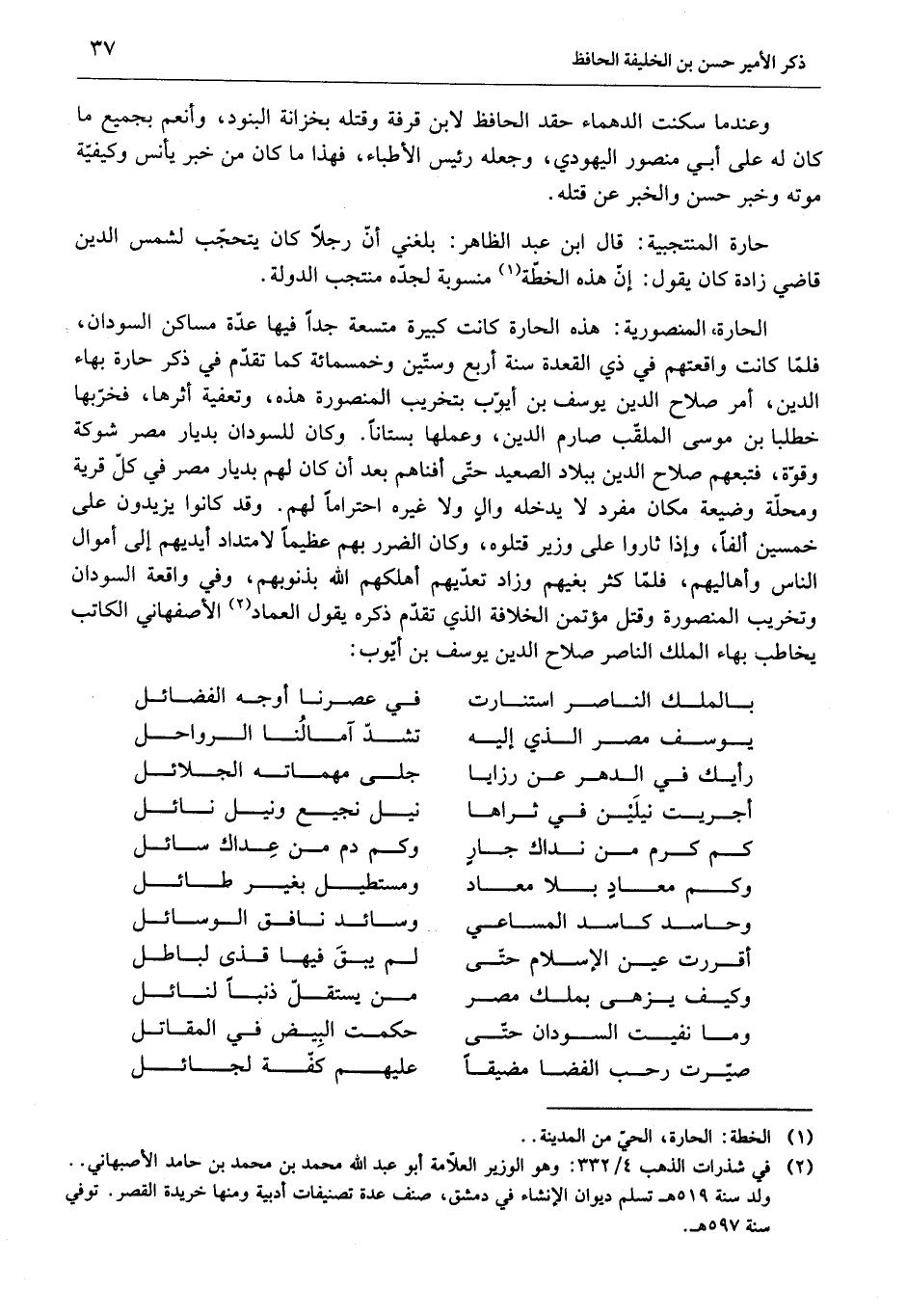 الحارة المنصورية: هذه الحارة كانت كبيرة متسعة جدا فيها عدّة مساكن السودان، فلمّا كانت واقعتهم في ذي القعدة سنة أربع وستّين وخمسمائة كما تقدّم في ذكر حارة بهاء الدين، أمر صلاح الدين يوسف بن أيّوب بتخريب المنصورة هذه، وتعفية أثرها، فخرّبها خطلبا بن موسى الملقّب صارم الدين، وعملها بستانا. وكان للسودان بديار مصر شوكة وقوّة، فتبعهم صلاح الدين ببلاد الصعيد حتّى أفناهم بعد أن كان لهم بديار مصر في كلّ قرية ومحلّة وضيعة مكان مفرد لا يدخله وال ولا غيره احتراما لهم. وقد كانوا يزيدون على خمسين ألفا، وإذا ثاروا على وزير قتلوه، وكان الضرر بهم عظيما لامتداد أيديهم إلى أموال الناس وأهاليهم، فلمّا كثر بغيهم وزاد تعدّيهم أهلكهم الله بذنوبهم، وفي واقعة السودان وتخريب المنصورة وقتل مؤتمن الخلافة الذي تقدّم ذكره يقول العماد «2» الأصفهاني الكاتب يخاطب بهاء الملك الناصر صلاح الدين يوسف بن أيّوب: