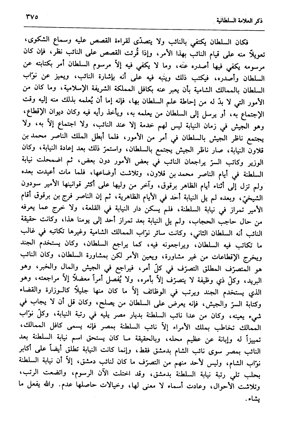 فكان السلطان يكتفي بالنائب ولا يتصدّى لقراءة القصص عليه وسماع الشكوى، تعويلا منه على قيام النائب بهذا الأمر، وإذا قرئت القصص على النائب نظر، فإن كان مرسومه يكفي فيها أصدره عنه، وما لا يكفي فيه إلّا مرسوم السلطان أمر بكتابته عن السلطان وأصدره، فيكتب ذلك وينبه فيه على أنه بإشارة النائب، ويميز عن نوّاب السلطان بالممالك الشامية بأن يعبر عنه بكافل المملكة الشريفة الإسلامية، وما كان من الأمور التي لا بدّ له من إحاطة علم السلطان بها، فإنه إما أن يعلمه بذلك منه إليه وقت الاجتماع به، أو يرسل إلى السلطان من يعلمه به، ويأخذ رأيه فيه وكان ديوان الإقطاع، وهو الجيش في زمان النيابة ليس لهم خدمة إلا عند النائب، ولا اجتماع إلّا به، ولا يجتمع ناظر الجيش بالسلطان في أمر من الأمور، فلما أبطل الملك الناصر محمد بن قلاون النيابة، صار ناظر الجيش يجتمع بالسلطان، واستمرّ ذلك بعد إعادة النيابة، وكان الوزير وكاتب السرّ يراجعان النائب في بعض الأمور دون بعض، ثم اضمحلت نيابة السلطنة في أيام الناصر محمد بن قلاون، وتلاشت أوضاعها، فلما مات أعيدت بعده ولم تزل إلى أثناء أيام الظاهر برقوق، وآخر من وليها على أكثر قوانينها الأمير سودون الشيخيّ، وبعده لم يل النيابة أحد في الأيام الظاهرية، ثم إن الناصر فرج بن برقوق أقام الأمير تمراز في نيابة السلطنة، فلم يسكن دار النيابة في القلعة، ولا خرج عما يعرفه من حال حاجب الحجاب، ولم يل النيابة بعد تمراز أحد إلى يومنا هذا، وكانت حقيقة النائب أنه السلطان الثاني، وكانت سائر نوّاب الممالك الشامية وغيرها تكاتبه في غالب ما تكاتب فيه السلطان، ويراجعونه فيه، كما يراجع السلطان، وكان يستخدم الجند ويخرج الإقطاعات من غير مشاورة، ويعين الأمر لكن بمشاورة السلطان، وكان النائب هو المتصرّف المطلق التصرّف في كلّ أمر، فيراجع في الجيش والمال والخبر، وهو البريد، وكلّ ذي وظيفة لا يتصرّف إلّا بأمره، ولا يفصل أمرا معضلا إلّا مراجعته، وهو الذي يستخدم الجند ويرتب في الوظائف إلّا ما كان منها جليلا كالوزارة والقضاء وكتابة السرّ والجيش، فإنه يعرض على السلطان من يصلح، وكان قل أن لا يجاب في شيء يعينه، وكان من عدا نائب السلطنة بديار مصر يليه في رتبة النيابة، وكلّ نوّاب الممالك تخاطب بملك الأمراء إلّا نائب السلطنة بمصر فإنه يسمى كافل الممالك، تمييزا له وإبانة عن عظيم محله، وبالحقيقة ما كان يستحق اسم نيابة السلطنة بعد النائب بمصر سوى نائب الشام بدمشق فقط، وإنما كانت النيابة تطلق أيضا على أكابر نوّاب الشام، وليس لأحد منهم من التصرّف ما كان لنائب دمشق، إلّا أن نيابة السلطنة بحلب تلي رتبة نيابة السلطنة بدمشق، وقد اختلت الآن الرسوم، واتضعت الرتب، وتلاشت الأحوال، وعادت أسماء لا معنى لها، وخيالات حاصلها عدم. والله يفعل ما يشاء.