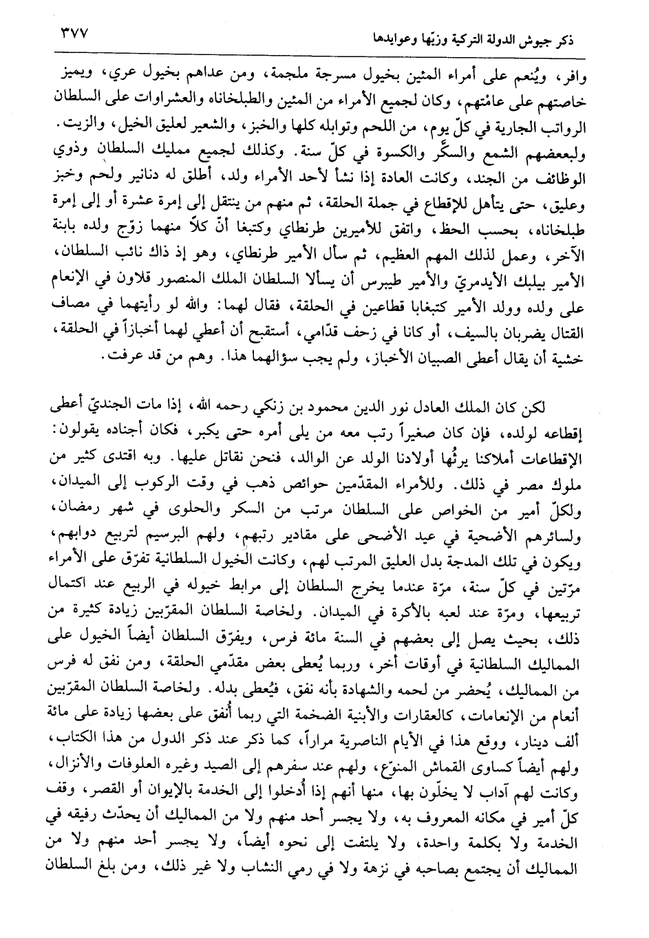 الإقطاعات أملاكنا يرثها أولادنا الولد عن الوالد، فنحن نقاتل عليها. وبه اقتدى كثير من ملوك مصر في ذلك. وللأمراء المقدّمين حوائص ذهب في وقت الركوب إلى الميدان، ولكلّ أمير من الخواص على السلطان مرتب من السكر والحلوى في شهر رمضان، ولسائرهم الأضحية في عيد الأضحى على مقادير رتبهم، ولهم البرسيم لتربيع دوابهم، ويكون في تلك المدجة بدل العليق المرتب لهم، وكانت الخيول السلطانية تفرّق على الأمراء مرّتين في كلّ سنة، مرّة عند ما يخرج السلطان إلى مرابط خيوله في الربيع عند اكتمال تربيعها، ومرّة عند لعبه بالأكرة في الميدان. ولخاصة السلطان المقرّبين زيادة كثيرة من ذلك، بحيث يصل إلى بعضهم في السنة مائة فرس، ويفرّق السلطان أيضا الخيول على المماليك السلطانية في أوقات أخر، وربما يعطى بعض مقدّمي الحلقة، ومن نفق له فرس من المماليك، يحضر من لحمه والشهادة بأنه نفق، فيعطى بدله. ولخاصة السلطان المقرّبين أنعام من الإنعامات، كالعقارات والأبنية الضخمة التي ربما أنفق على بعضها زيادة على مائة ألف دينار، ووقع هذا في الأيام الناصرية مرارا، كما ذكر عند ذكر الدول من هذا الكتاب، ولهم أيضا كساوى القماش المنوّع، ولهم عند سفرهم إلى الصيد وغيره العلوفات والأنزال، وكانت لهم آداب لا يخلّون بها، منها أنهم إذا أدخلوا إلى الخدمة بالإيوان أو القصر، وقف كلّ أمير في مكانه المعروف به، ولا يجسر أحد منهم ولا من المماليك أن يحدّث رفيقه في الخدمة ولا بكلمة واحدة، ولا يلتفت إلى نحوه أيضا، ولا يجسر أحد منهم ولا من المماليك أن يجتمع بصاحبه في نزهة ولا في رمي النشاب ولا غير ذلك، ومن بلغ السلطان