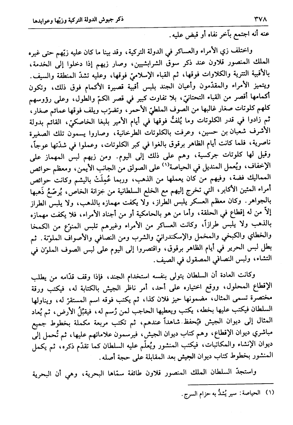 ويتميز الأمراء والمقدّمون وأعيان الجند بلبس أقبية قصيرة الأكمام فوق ذلك، وتكون أكمامها أقصر من القباء التحتانيّ، بلا تفاوت كبير في قصر الكمّ والطول، وعلى رؤوسهم كلهم كلوتات صغار غالبها من الصوف الملطيّ الأحمر، وتضرب ويلف فوقها عمائم صغار، ثم زادوا في قدر الكلوتات وما يلفّ فوقها في أيام الأمير بلبغا الخاصكيّ، القائم بدولة الأشرف شعبان بن حسين، وعرفت بالكلوتات الطرخانية، وصاروا يسمون تلك الصغيرة ناصرية، فلما كانت أيام الظاهر برقوق بالغوا في كبر الكلوتات، وعملوا في شدّتها عوجا، وقيل لها كلوتات جركسية، وهم على ذلك إلى اليوم. ومن زيهم لبس المهماز على الإخفاف، ويعمل المنديل في الحياصة «1» على الصولق من الجانب الأيمن، ومعظم حوائص المماليك فضة، وفيهم من كان يعملها من الذهب، وربما عملت باليشم وكانت حوائص أمراء المئين الأكابر، التي تخرج إليهم مع الخلع السلطانية من خزانة الخاص، يرصّع ذهبها بالجواهر. وكان معظم العسكر يلبس الطراز، ولا يكفت مهمازه بالذهب، ولا يلبس الطراز إلّا من له إقطاع في الحلقة، وأما من هو بالحامكية أو من أجناد الأمراء، فلا يكفت مهمازه بالذهب ولا يلبس طرازا، وكانت العساكر من الأمراء وغيرهم تلبس المنوّع من الكمخا والخطاي والكبخي والمخمل والإسكندرانيّ والشرب ومن النصافي والأصواف الملوّنة. ثم بطل لبس الحرير في أيام الظاهر برقوق، واقتصروا إلى اليوم على لبس الصوف الملوّن في الشتاء، ولبس النصافي المصقول في الصيف.