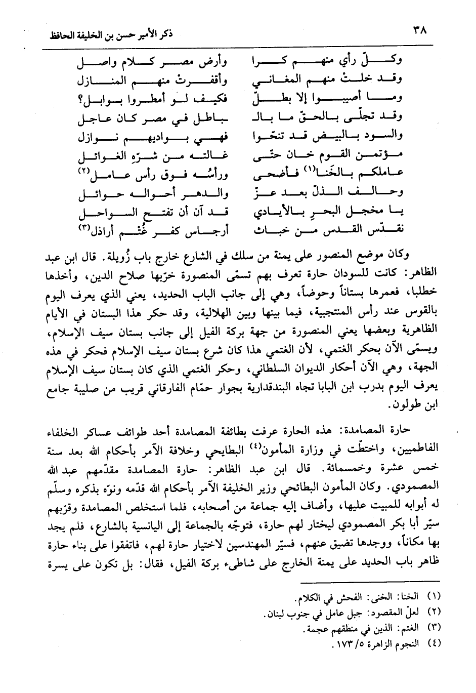 حارة المصامدة: هذه الحارة عرفت بطائفة المصامدة أحد طوائف عساكر الخلفاء الفاطميين، واختطّت في وزارة المأمون «4» البطائحي وخلافة الآمر بأحكام الله بعد سنة خمس عشرة وخمسمائة. قال ابن عبد الظاهر: حارة المصامدة مقدّمهم عبد الله المصمودي. وكان المأمون البطائحي وزير الخليفة الآمر بأحكام الله قدّمه ونوّه بذكره وسلّم له أبوابه للمبيت عليها، وأضاف إليه جماعة من أصحابه، فلما استخلص المصامدة وقرّبهم سيّر أبا بكر المصمودي ليختار لهم حارة، فتوجّه بالجماعة إلى اليانسية بالشارع، فلم يجد بها مكانا، ووجدها تضيق عنهم، فسيّر المهندسين لاختيار حارة لهم، فاتفقوا على بناء حارة ظاهر باب الحديد على يمنة الخارج على شاطىء بركة الفيل، فقال: بل تكون على يسرة