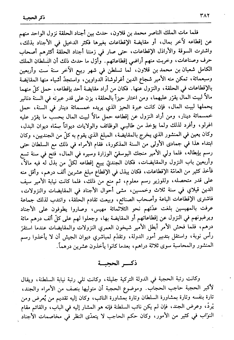 وكانت رتبة الحجبة في الدولة التركية جليلة، وكانت تلي رتبة نيابة السلطنة، ويقال لأكبر الحجبة حاجب الحجاب. وموضوع الحجبة أن متوليها بنصف من الأمراء والجند، تارة بنفسه وتارة بمشاورة السلطان وتارة بمشاورة النائب، وكان إليه تقديم من يعرض ومن يردّ، وعرض الجند، فإن لم يكن نائب السلطنة فإنه هو المشار إليه في الباب، والقائم مقام النوّاب في كثير من الأمور، وكان حكم الحاجب لا يتعدّى النظر في مخاصمات الأجناد