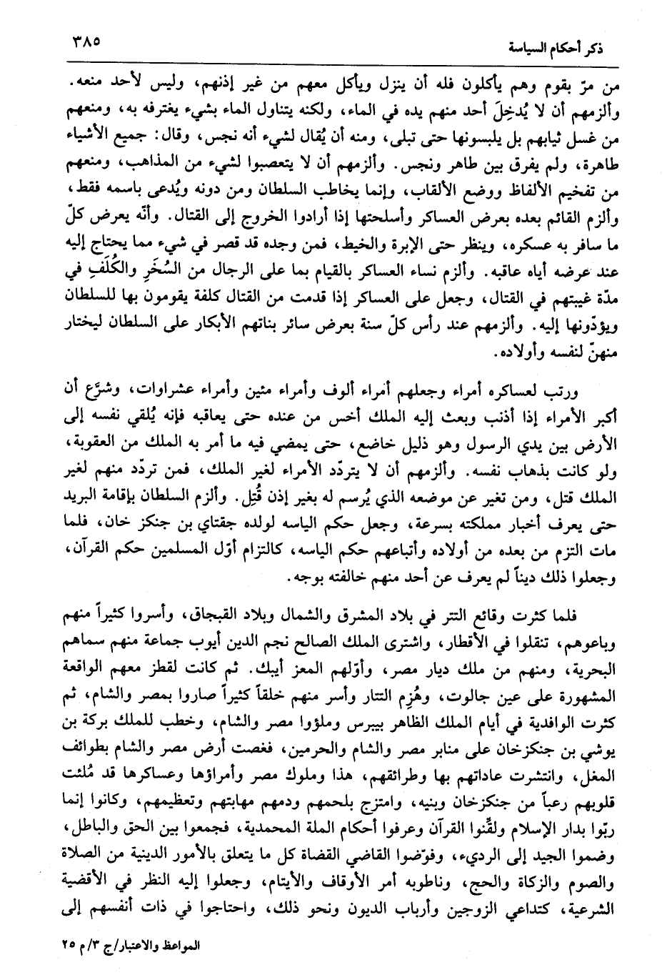 وألزمهم أن لا يدخل أحد منهم يده في الماء، ولكنه يتناول الماء بشيء يغترفه به، ومنعهم من غسل ثيابهم بل يلبسونها حتى تبلى، ومنه أن يقال لشيء أنه نجس، وقال: جميع الأشياء طاهرة، ولم يفرق بين طاهر ونجس. وألزمهم أن لا يتعصبوا لشيء من المذاهب، ومنعهم من تفخيم الألفاظ ووضع الألقاب، وإنما يخاطب السلطان ومن دونه ويدعى باسمه فقط، وألزم القائم بعده بعرض العساكر وأسلحتها إذا أرادوا الخروج إلى القتال. وأنّه يعرض كلّ ما سافر به عسكره، وينظر حتى الإبرة والخيط، فمن وجده قد قصر في شيء مما يحتاج إليه عند عرضه أياه عاقبه. وألزم نساء العساكر بالقيام بما على الرجال من السخر والكلف في مدّة غيبتهم في القتال، وجعل على العساكر إذا قدمت من القتال كلفة يقومون بها للسلطان ويؤدّونها إليه. وألزمهم عند رأس كلّ سنة بعرض سائر بناتهم الأبكار على السلطان ليختار منهنّ لنفسه وأولاده.