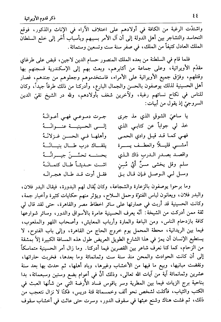 فلما قام في السلطنة من بعده الملك المنصور حسام الدين لاجين، قبض على طرغاي مقدّم الأويراتية، وعلى جماعة من أكابرهم، وبعث بهم إلى الإسكندرية فسجنهم بها وقتلهم، وفرّق جميع الأويراتية على الأمراء، فاستخدموهم وجعلوهم من جندهم، فصار أهل الحسينية لذلك يوصفون بالحسن والجمال البارع، وأدركنا من ذلك طرفا جيدا، وكان للناس في نكاح نسائهم رغبة، ولآخرين شغف بأولادهم، ولله در الشيخ تقيّ الدين السروجيّ إذ يقول من أبيات: