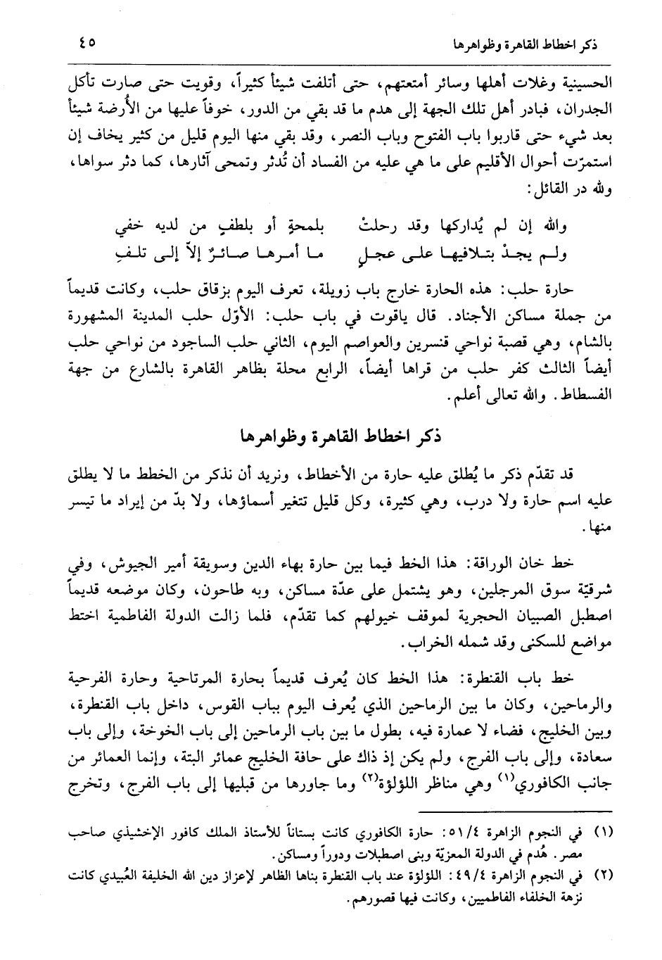 الحسينية وغلات أهلها وسائر أمتعتهم، حتى أتلفت شيئا كثيرا، وقويت حتى صارت تأكل الجدران، فبادر أهل تلك الجهة إلى هدم ما قد بقي من الدور، خوفا عليها من الأرضة شيئا بعد شيء حتى قاربوا باب الفتوح وباب النصر، وقد بقي منها اليوم قليل من كثير يخاف إن استمرّت أحوال الإقليم على ما هي عليه من الفساد أن تدثر وتمحى آثارها، كما دثر سواها، ولله در القائل: