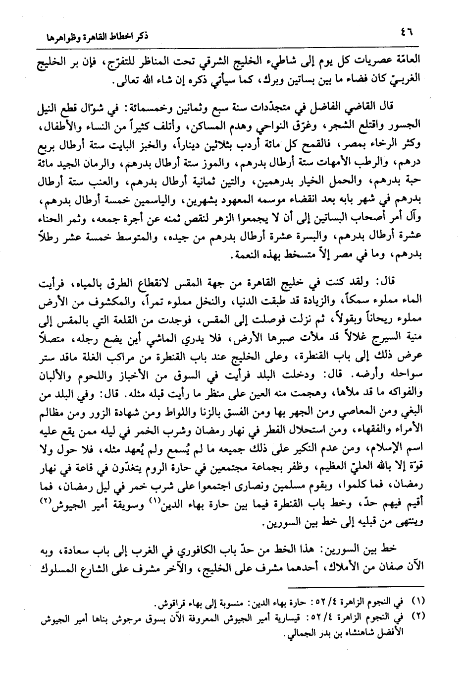قال: ولقد كنت في خليج القاهرة من جهة المقس لانقطاع الطرق بالمياه، فرأيت الماء مملوء سمكا، والزيادة قد طبقت الدنيا، والنخل مملوء تمرا، والمكشوف من الأرض مملوء ريحانا وبقولا، ثم نزلت فوصلت إلى المقس، فوجدت من القلعة التي بالمقس إلى منية السيرج غلالا قد ملأت صبرها الأرض، فلا يدري الماشي أين يضع رجله، متصلا عرض ذلك إلى باب القنطرة، وعلى الخليج عند باب القنطرة من مراكب الغلة ما قد ستر سواحله وأرضه. قال: ودخلت البلد فرأيت في السوق من الأخباز واللحوم والألبان والفواكه ما قد ملأها، وهجمت منه العين على منظر ما رأيت قبله مثله. قال: وفي البلد من البغي ومن المعاصي ومن الجهر بها ومن الفسق بالزنا واللواط ومن شهادة الزور ومن مظالم الأمراء والفقهاء، ومن استحلال الفطر في نهار رمضان وشرب الخمر في ليله ممن يقع عليه اسم الإسلام، ومن عدم النكير على ذلك جميعه ما لم يسمع ولم يعهد مثله، فلا حول ولا قوّة إلا بالله العليّ العظيم، وظفر بجماعة مجتمعين في حارة الروم يتغدّون في قاعة في نهار رمضان، فما كلموا، وبقوم مسلمين ونصارى اجتمعوا على شرب خمر في ليل رمضان، فما أقيم فيهم حدّ، وخط باب القنطرة فيما بين حارة بهاء الدين «1» وسويقة أمير الجيوش «2» وينتهى من قبليه إلى خط بين السورين.