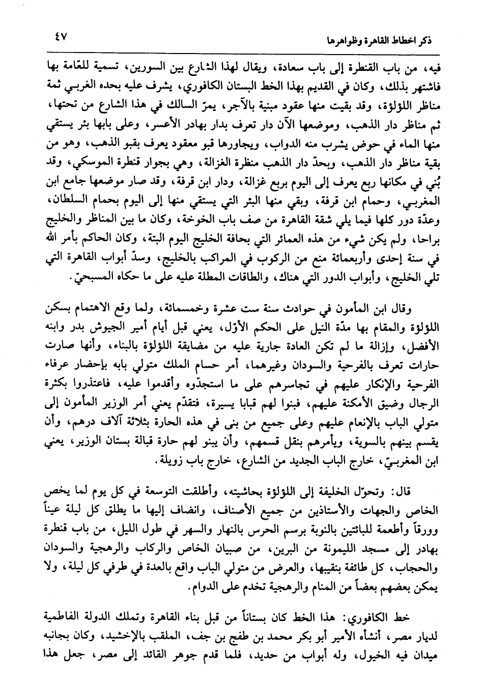 فيه، من باب القنطرة إلى باب سعادة، ويقال لهذا الشارع بين السورين، تسمية للعّامة بها فاشتهر بذلك، وكان في القديم بهذا الخط البستان الكافوري، يشرف عليه بحده الغربي ثمة مناظر اللؤلؤة، وقد بقيت منها عقود مبنية بالآجر، يمرّ السالك في هذا الشارع من تحتها، ثم مناظر دار الذهب، وموضعها الآن دار تعرف بدار بهادر الأعسر، وعلى بابها بئر يستقي منها الماء في حوض يشرب منه الدواب، ويجاورها قبو معقود يعرف بقبو الذهب، وهو من بقية مناظر دار الذهب، وبحدّ دار الذهب منظرة الغزالة، وهي بجوار قنطرة الموسكي، وقد بني في مكانها ربع يعرف إلى اليوم بربع غزالة، ودار ابن قرفة، وقد صار موضعها جامع ابن المغربي، وحمام ابن قرفة، وبقي منها البئر التي يستقي منها إلى اليوم بحمام السلطان، وعدّة دور كلها فيما يلي شقة القاهرة من صف باب الخوخة، وكان ما بين المناظر والخليج براحا، ولم يكن شيء من هذه العمائر التي بحافة الخليج اليوم البتة، وكان الحاكم بأمر الله في سنة إحدى وأربعمائة منع من الركوب في المراكب بالخليج، وسدّ أبواب القاهرة التي تلي الخليج، وأبواب الدور التي هناك، والطاقات المطلة عليه على ما حكاه المسبحيّ.