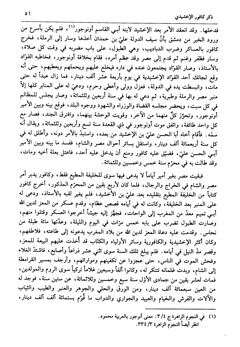 فبقيت مصر بغير أمير أياما لا يدعى فيها سوى للخليفة المطيع فقط، وكافور يدبر أمر مصر والشام في الخراج والرجال، فلما كان لأربع بقين من المحرّم المذكور، أخرج كافور كتابا من الخليفة المطيع بتقليده بعد عليّ بن الإخشيد، فلم يغير لقبه بالأستاذ، ودعى له على المنبر بعد الخليفة، وكانت له في أيامه قصص عظام، وقدم عسكر من المعز لدين الله أبي تميم معدّ من المغرب إلى الواحات، فجهّز إليه جيشا أخرجوا العسكر وقتلوا منهم، وصارت الطبول تضرب على بابه خمس مرّات في اليوم والليلة، وعدّتها مائة طبلة من نحاس. وقدمت عليه دعاة المعز لدين الله من بلاد المغرب يدعونه إلى طاعته، فلاطفهم، وكان أكثر الإخشيدية والكافورية وسائر الأولياء والكتّاب قد أخذت عليهم البيعة للمعز، وقصر مدّ النيل في أيامه. فلم يبلغ تلك السنة سوى اثني عشر ذراعا وأصابع، فاشتدّ الغلاء وفحش الموت في الناس، حتى عجزوا عن تكفينهم ومواراتهم، وأرجف بمسير القرامطة إلى الشام، وبدت غلمانه تتنكر له، وكانوا ألفا وسبعين غلاما تركيا سوى الروم والمولدين، فمات لعشر بقين من جمادى الأوّل سنة سبع وخمسين وثلاثمائة، عن ستين سنة، فوجد له من العين سبعمائة ألف دينار، ومن الورق والحلي والجوهر والعنبر والطيب والثياب والآلات والفرش والخيام والعبيد والجواري والدواب ما قوّم بستمائة ألف ألف دينار،