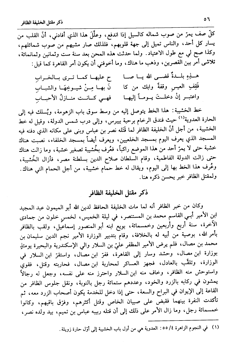 كلّ صف يمرّ من صوب شماله كالسيل إذا اندفع، وعلّل هذا الذي أفادني، أنّ القلب من يسار كل أحد، والناس تميل إلى جهة قلوبهم، فلذلك صار مشيهم من صوب شمائلهم، وكذا صح لي مع طول الاعتياد. ولما حدثت هذه المحن بعد سنة ست وثمانين وثمانمائة، تلاشى أمر بين القصرين، وذهب ما هناك، وما أخوفني أن يكون أمر القاهرة كما قيل: