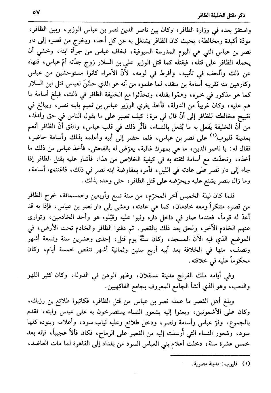 واستقرّ بعده في وزارة الظافر، وكان بين ناصر الدين نصر بن عباس الوزير، وبين الظافر، مودّة أكيدة ومخالطة، بحيث كان الظافر يشتغل به عن كل أحد، ويخرج من قصره إلى دار نصر بن عباس التي هي اليوم المدرسة السيوفية، فخاف عباس من جرأة ابنه، وخشي أن يحمله الظافر على قتله، فيقتله كما قتل الوزير علي بن السلار زوج جدّته أمّ عباس، فنهاه عن ذلك وألحف في تأنيبه، وأفرط في لومه، لأنّ الأمراء كانوا مستوحشين من عباس وكارهين منه تقريبه أسامة بن منقد، لما علموه من أنه هو الذي حسّن لعباس قتل ابن السلار كما هو مذكور في خبره، وهمّوا بقتله، وتحدّثوا مع الخليفة الظافر في ذلك، فبلغ أسامة ما هم عليه، وكان غريبا من الدولة، فأخذ يغري الوزير عباس بن تميم بابنه نصر، ويبالغ في تقبيح مخالطته للظافر إلى أن قال لي مرة: كيف تصبر على ما يقول الناس في حق ولدك، من أنّ الخليفة يفعل به ما يفعل بالنساء، فأثّر ذلك في قلب عباس، واتفق أنّ الظافر أنعم بمدينة قليوب «1» على نصر بن عباس، فلما حضر إلى أبيه وأعلمه بذلك وأسامة حاضر، فقال له: يا ناصر الدين، ما هي بمهرك غالية، يعرّض له بالفحش، فأخذ عباس من ذلك ما أخذه، وتحدّث مع أسامة لثقته به في كيفية الخلاص من هذا، فأشار عليه بقتل الظافر إذا جاء إلى دار نصر على عادته في الليل، فأمره بمفاوضة ابنه نصر في ذلك، فاغتنمها أسامة، وما زال بنصر يشنع عليه ويحرّضه على قتل الظافر، حتى وعده بذلك.