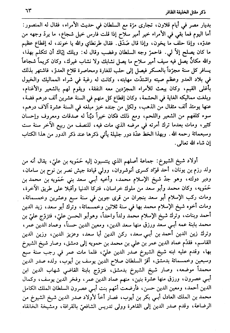 أولاد شيخ الشيوخ: جماعة أصلهم الذي ينتسبون إليه حمويه بن عليّ، يقال أنه من ولد رزم بن يونان، أحد قوّاد كسرى أنوشروان، وولي قيادة جيش نصر بن نوح بن سامان، ودبر دولته، وهو جدّ شيخ الإسلام محمد، وأخيه أبي سعد بني حمويه بن محمد بن حمويه، وكان محمد وأبو سعد من ملوك خراسان، فتركا الدنيا وأقبلا على طريق الآخرة، ومات ركب الإسلام أبو سعد بنجران من قرى جوين في سنة سبع وعشرين وخمسمائة، ومات أخوه شيخ الإسلام محمد بها في سنة ثلاثين وخمسمائة، وترك أبو سعد، زيد الدين أحمد وبنات، وترك شيخ الإسلام محمد ولدا واحدا، وهو أبو الحسن عليّ، فتزوّج عليّ بن محمد بابنة عمه أبي سعد ورزق منها سعد الدين، ومعين الدين حسنا، وعماد الدين عمر، وترك زين الدين أحمد بن أبي سعد، ركن الدين أبا سعد، وعزيز الدين، وزين الدين القاسم، فقدّم عماد الدين عمر بن علي بن محمد بن حمويه إلى دمشق، وصار شيخ الشيوخ بها، وقدم عليه ابنه شيخ الشيوخ صدر الدين عليّ، فلما مات عمر في رجب سنة سبع وسبعين وخمسمائة بدمشق، أقرّ السلطان صلاح الدين يوسف بن أيوب، ولده صدر الدين محمدا موضعه، وصار شيخ الشيوخ بدمشق، فتزوّج بابنة القاضي شهاب الدين ابن أبي عصرون، ورزق منها عشرة بنين، منهم عماد الدين عمر، وفخر الدين يوسف، وكمال الدين أحمد، ومعين الدين حسن، فأرضعت أمّهم بنت أبي عصرون السلطان الملك الكامل محمد بن الملك العادل أبي بكر بن أيوب، فصار أخا لأولاد صدر الدين شيخ الشيوخ من الرضاعة، وقدم صدر الدين إلى القاهرة وولى تدريس الشافعيّ بالقرافة، ومشيخة الخانقاه