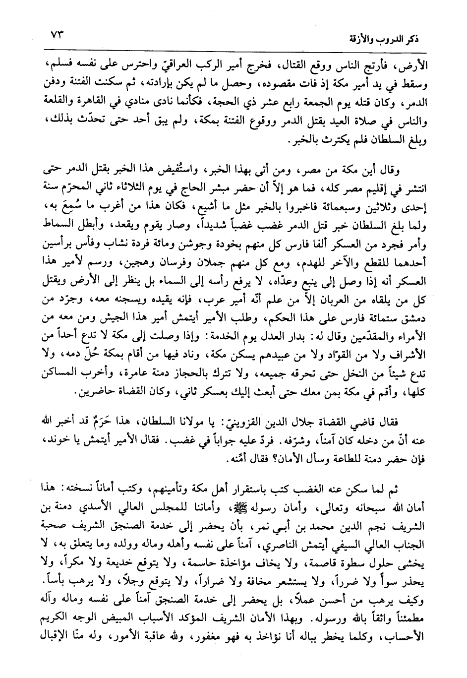 فقال قاضي القضاة جلال الدين القزوينيّ: يا مولانا السلطان، هذا حرم قد أخبر الله عنه أنّ من دخله كان آمنا، وشرّفه. فردّ عليه جوابا في غضب. فقال الأمير أيتمش يا خوند، فإن حضر دمنة للطاعة وسأل الأمان؟ فقال أمّنه.