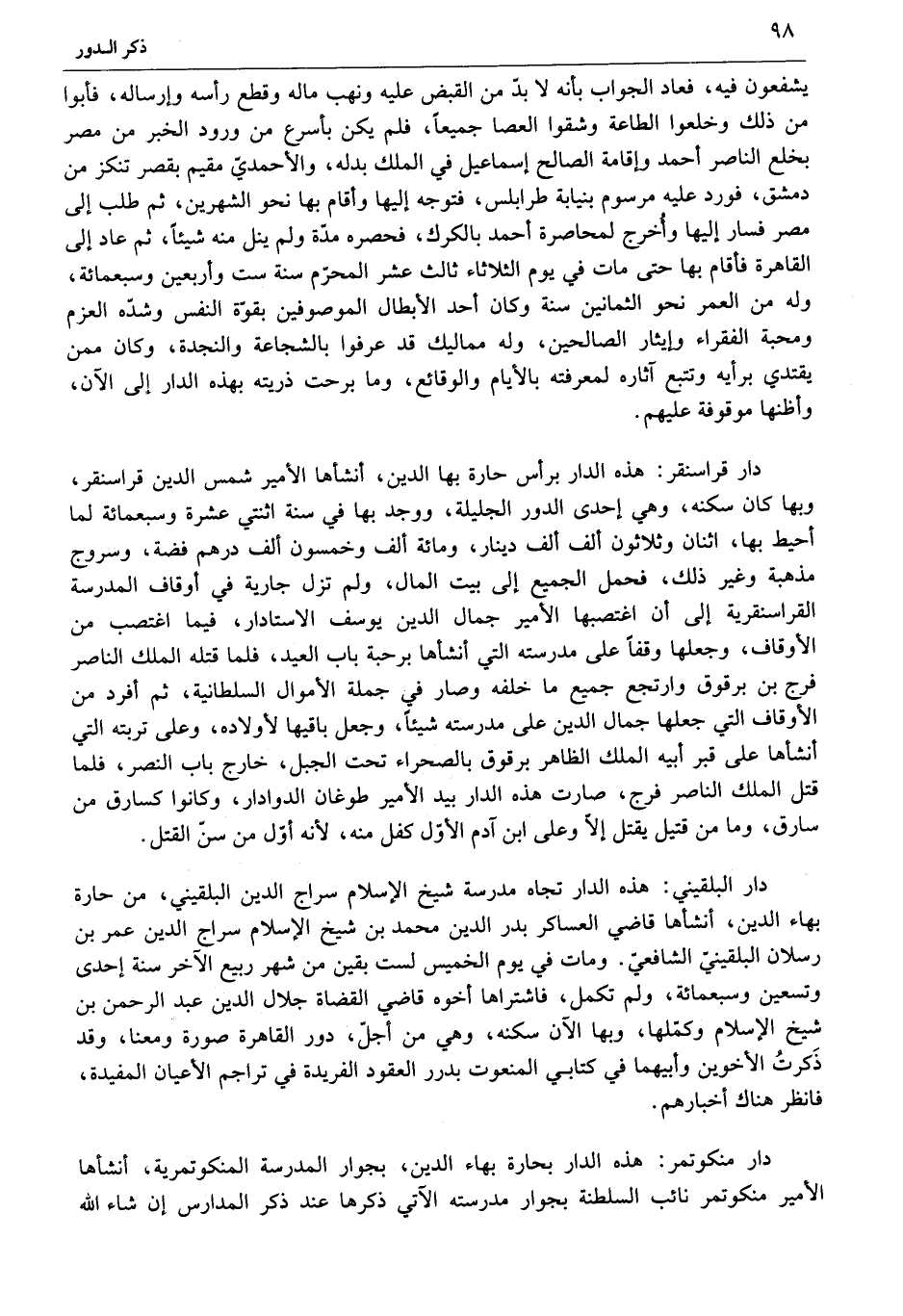 دار قراسنقر: هذه الدار برأس حارة بها الدين، أنشأها الأمير شمس الدين قراسنقر، وبها كان سكنه، وهي إحدى الدور الجليلة، ووجد بها في سنة اثنتي عشرة وسبعمائة لما أحيط بها، اثنان وثلاثون ألف ألف دينار، ومائة ألف وخمسون ألف درهم فضة، وسروج مذهبة وغير ذلك، فحمل الجميع إلى بيت المال، ولم تزل جارية في أوقاف المدرسة القراسنقرية إلى أن اغتصبها الأمير جمال الدين يوسف الاستادار، فيما اغتصب من الأوقاف، وجعلها وقفا على مدرسته التي أنشأها برحبة باب العيد، فلما قتله الملك الناصر فرج بن برقوق وارتجع جميع ما خلفه وصار في جملة الأموال السلطانية، ثم أفرد من الأوقاف التي جعلها جمال الدين على مدرسته شيئا، وجعل باقيها لأولاده، وعلى تربته التي أنشأها على قبر أبيه الملك الظاهر برقوق بالصحراء تحت الجبل، خارج باب النصر، فلما قتل الملك الناصر فرج، صارت هذه الدار بيد الأمير طوغان الدوادار، وكانوا كسارق من سارق، وما من قتيل يقتل إلّا وعلى ابن آدم الأوّل كفل منه، لأنه أوّل من سنّ القتل.