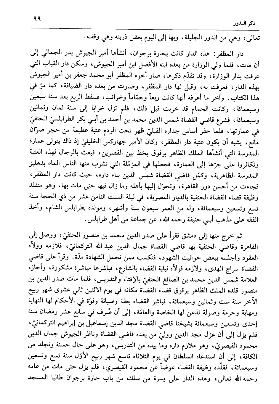 دار المظفر: هذه الدار كانت بحارة برجوان، أنشأها أمير الجيوش بدر الجمالي إلى أن مات، فلما ولي الوزارة من بعده ابنه الأفضل ابن أمير الجيوش، وسكن دار القباب التي عرفت بدار الوزارة، وقد تقدّم ذكرها، صار أخوه المظفر أبو محمد جعفر بن أمير الجيوش بهذه الدار، فعرفت به، وقيل لها دار المظفر، وصارت من بعده دار الضيافة، كما مرّ في هذا الكتاب. وآخر ما أعرفه أنها كانت ربعا وحمّاما وخرائب، فسقط الربع بعد سنة سبعين وسبعمائة، وكانت الحمام قد خربت قبل ذلك، فلم تزل خرابا إلى سنة ثمان وثمانين وسبعمائة، فشرع قاضي القضاة شمس الدين محمد بن أحمد بن أبي بكر الطرابلسيّ الحنفيّ في عمارتها، فلما حفر أساس جداره القبليّ ظهر تحت الردم عتبة عظيمة من حجر صوّان مانع، يشبه أن يكون عتبة دار المظفر، وكان الأمير جهاركس الخليليّ إذ ذاك يتولى عمارة المدرسة التي أنشأها الملك الظاهر برقوق بخط بين القصرين، فبعث بالرجال لهذه العتبة وتكاثروا على جرّها إلى العمارة، فجعلها في المزمّلة التي تشرب منها الناس الماء بدهليز المدرسة الظاهرية، وكمّل قاضي القضاة شمس الدين بناء داره، حيث كانت دار المظفر، فجاءت من أحسن دور القاهرة، وتحوّل إليها بأهله وما زال فيها حتى مات بها، وهو متقلد وظيفة قضاء القضاة الحنفية بالديار المصرية، في ليلة السبت الثامن عشر من ذي الحجة سنة تسع وتسعين وسبعمائة، وله من العمر سبعون سنة وأشهر، ومولده بطرابلس الشام، وأخذ الفقه على مذهب أبي حنفية رحمه الله، عن جماعة من أهل طرابلس.
