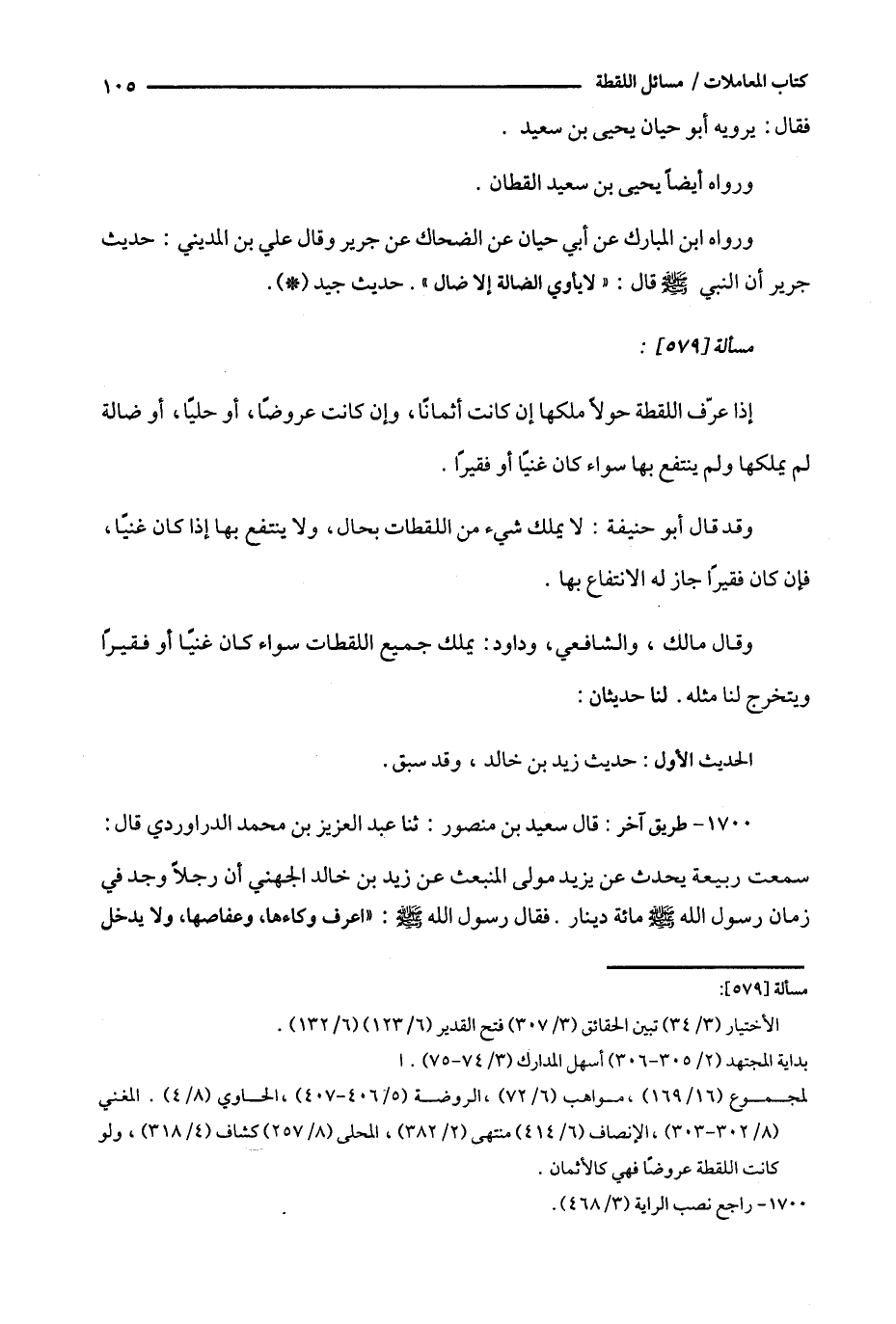 1700 - طريق آخر : قال سعيد بن منصور : ثنا عبد العزيز بن محمد الدراوردي قال : سمعت ربيعة يحدث عن يزيد مولى المنبعث عن زيد بن خالد الجهني أن رجلاً وجد في زمان رسول الله مائة دينار . فقال رسول الله : ' اعرف وكاءها ، وعفاصها ، ولا يدخل