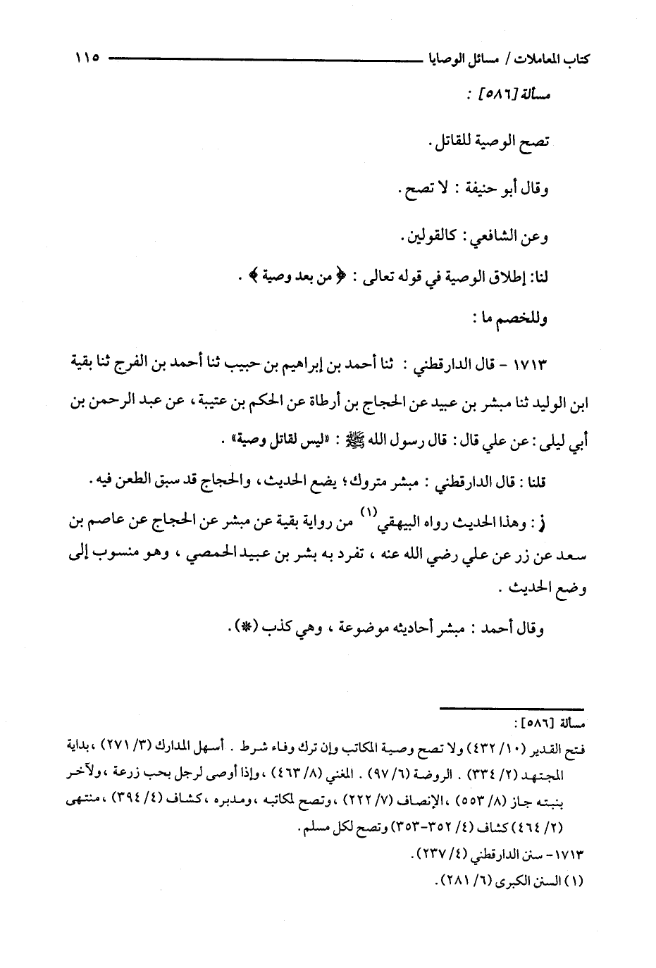 1713 - قال الدارقطني : ثنا أحمد بن إبراهيم بن حبيب ثنا أحمد بن الفرج ثنا بقية ابن الوليد ثنا مبشر بن عبيد عن الحجاج بن أرطاة عن الحكم بن عتيبة ، عن عبد الرحمن بن أبي ليلى : عن علي قال : قال رسول الله : ' ليس لقاتل وصية ' .