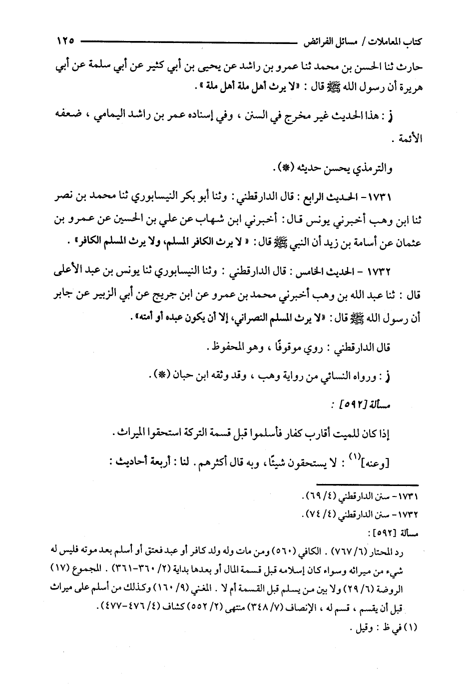 1731 - الحديث الرابع : قال الدارقطني : وثنا أبو بكر النيسابوري ثنا محمد بن نصر ثنا ابن وهب أخبرني يونس قال : أخبرني ابن شهاب عن علي بن الحسين عن عمرو بن عثمان عن أسامة بن زيد أن النبي قال : ' لا يرث الكافر المسلم ، ولا يرث المسلم الكافر ' .