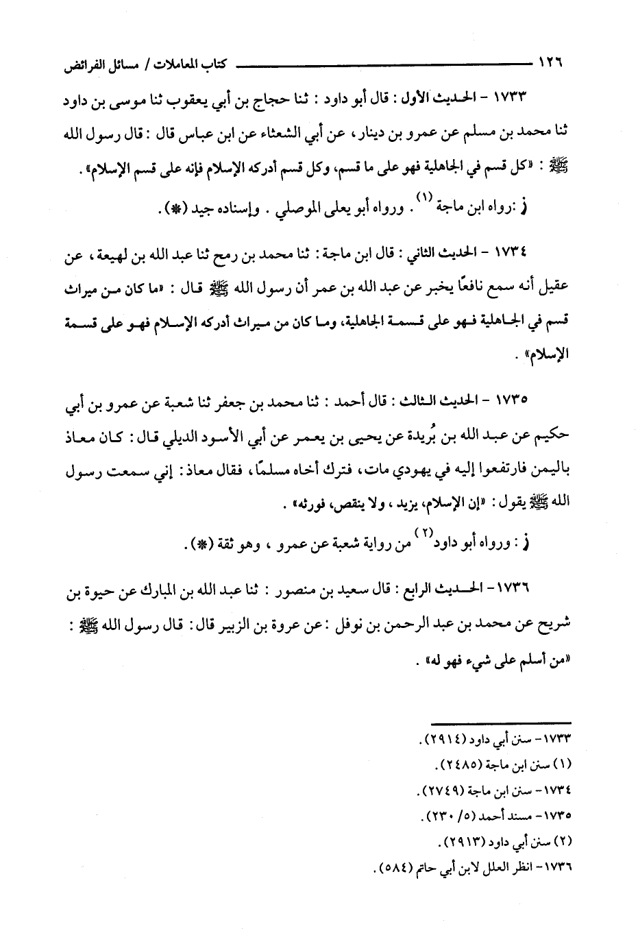 1734 - الحديث الثاني : قال ابن ماجة : ثنا محمد بن رمح ثنا عبد الله بن لهيعة ، عن عقيل أنه سمع نافعاً يخبر عن عبد الله بن عمر أن رسول الله قال : ' ما كان من ميراث قسم في الجاهلية فهو على قسمة الجاهلية ، وما كان من ميراث أدركه الإسلام فهو على قسمة الإسلام ' .