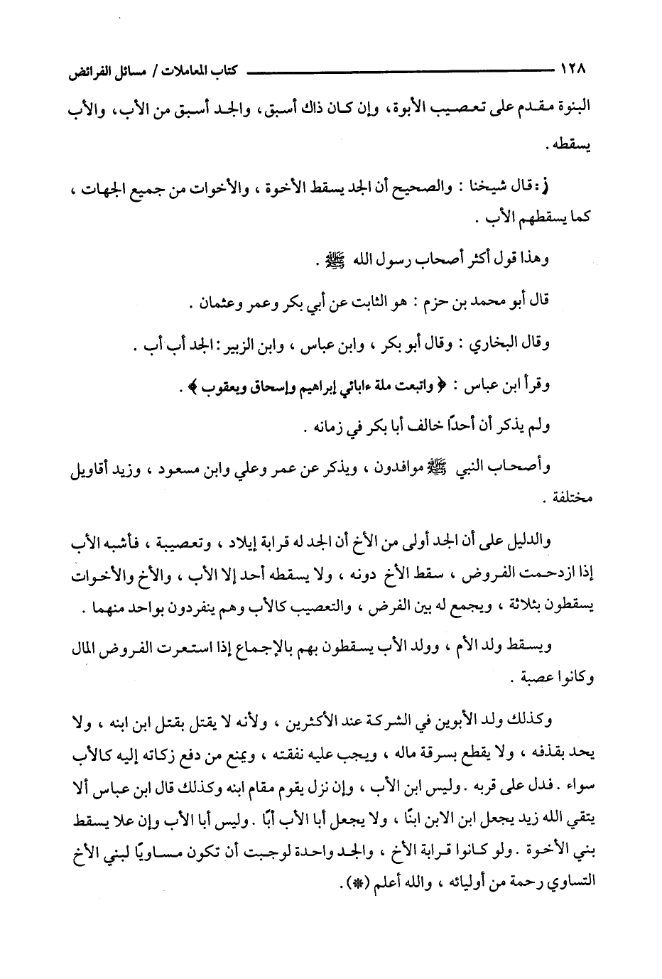 وكذلك ولد الأبوين في الشركة عند الأكثرين ، ولأنه لا يقتل بقتل ابن ابنه ، ولا يحد بقذفه ، ولا يقطع بسرقة ماله ، ويجب عليه نفقته ، ويمنع من دفع زكاته إليه كالأب سواء . فدل على قربه . وليس ابن الأب ، وإن نزل يقوم مقام ابنه وكذلك قال ابن عباس ألا يتقي الله زيد يجعل ابن الابن ابنا ، ولا يجعل أبا الأب أبا وليس أبا الأب وإن علا يسقط بني الأخوة . ولو كانوا قرابة الأخ ، والجد واحدة لوجبت أن تكون مساوياً لبني الأخ التساوي رحمة من أوليائه ، والله أعلم .