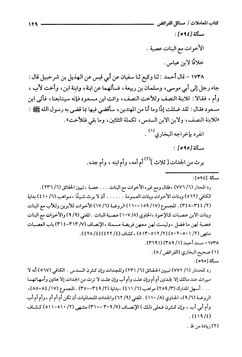1738 - قال أحمد : ثنا وكيع ثنا سفيان عن أبي قيس عن الهذيل بن شرحبيل قال : جاء رجل إلى أبي موسى ، وسلمان بن ربيعة ، فسألهما عن ابنة ، وابنه ابن ، وأخت لأب ، وأم ، فقالا : للابنة النصف وللأخت النصف ، وائت ابن مسعود فإنه سيتابعنا ، فأتى ابن مسعود فقال : لقد ضللت إذاً وما أنا من المهتدين ، سأقضي فيها بما قضى به رسول الله : ' للابنة النصف ، ولابن الابن السدس ، تكملة الثلثين ، وما بقي فللأخت ' .