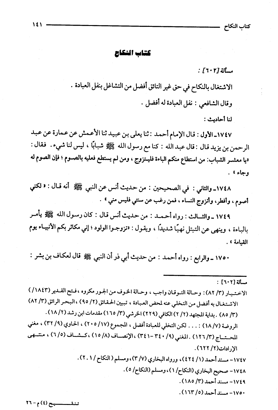 1747 - الأول : قال الإمام أحمد : ثنا يعلى بن عبيد ثنا الأعمش عن عمارة عن عبد الرحمن بن يزيد قال : قال عبد الله : ' كنا مع رسول الله شباباً ، ليس لنا شيء . فقال : ' يا معشر الشباب : من استطاع منكم الباءة فليتزوج ، ومن لم يستطع فعليه بالصوم ؛ فإن الصوم له وجاء ' .
