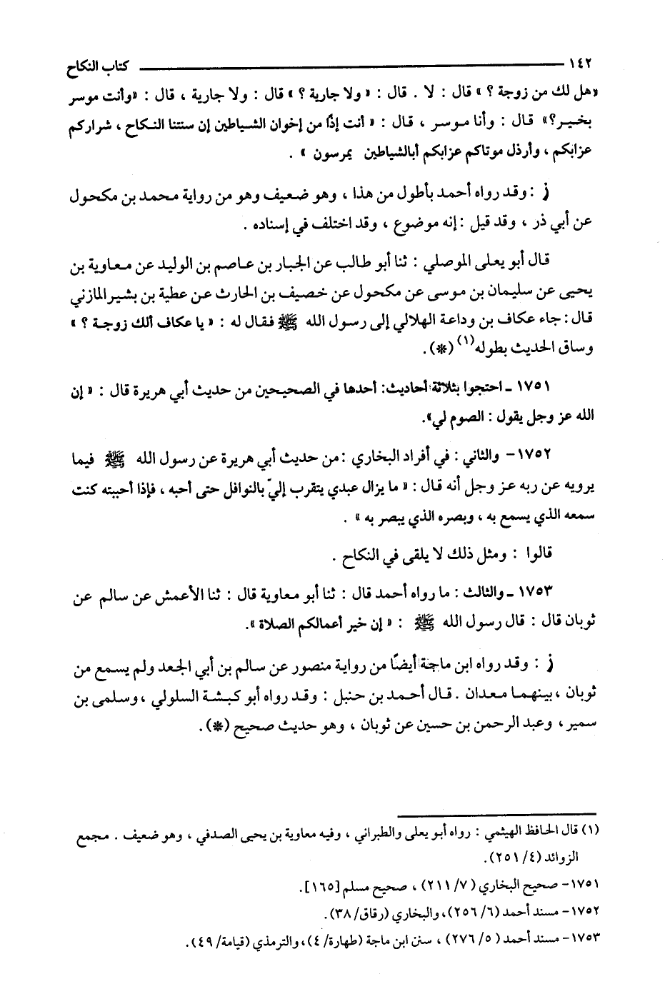 ' هل لك من زوجة ؟ ' قال : لا . قال : ' ولا جارية ؟ ' قال : ولا جارية ، قال : ' وأنت موسر بخير ؟ ' قال : وأنا موسر ، قال : ' أنت إذاً من إخوان الشياطين إن سنتنا النكاح ، شراركم عزابكم ، وأرذل موتاكم عزابكم أبالشياطين يمرسون ' .