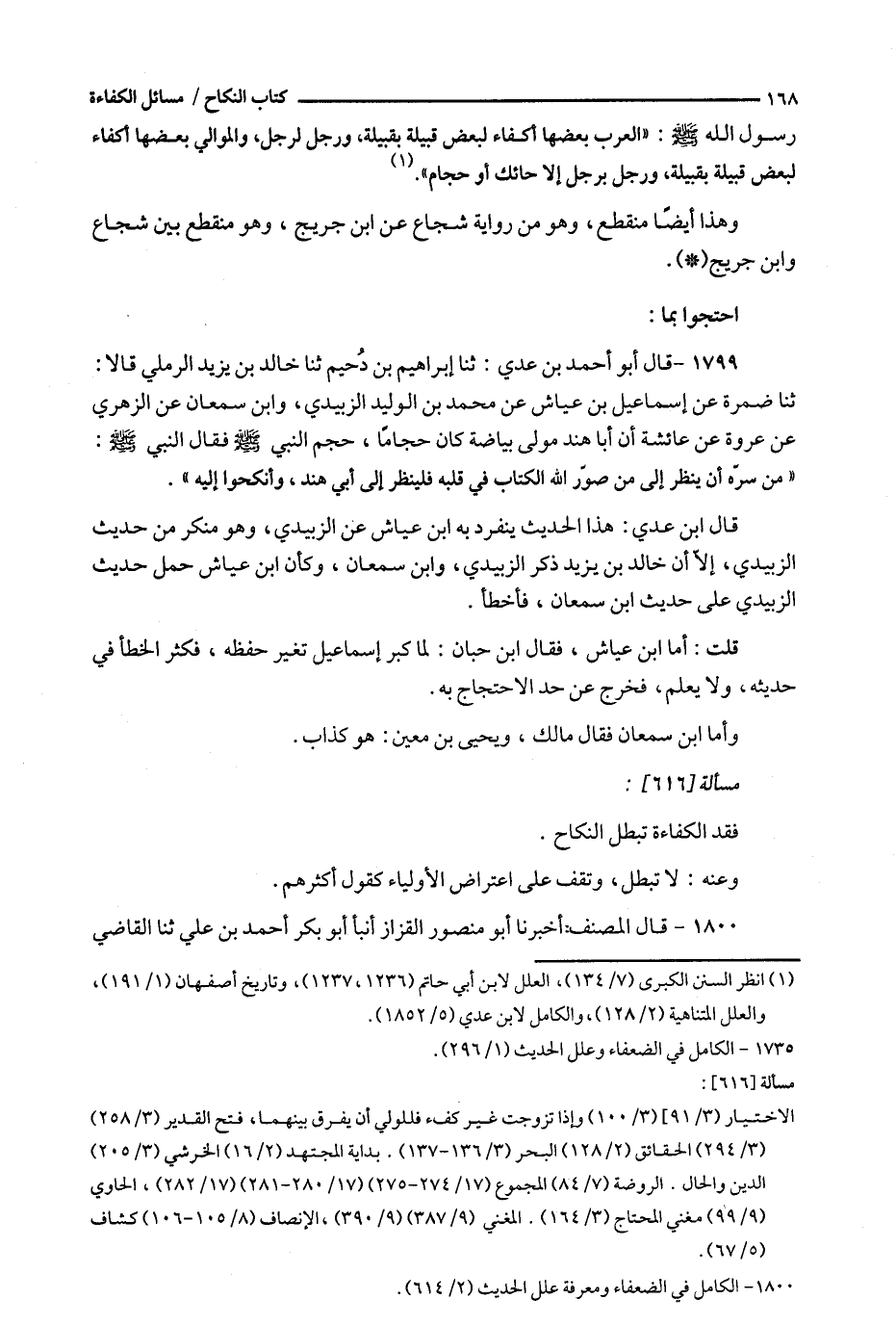 رسول الله : ' العرب بعضها أكفاء لبعض قبيلة بقبيلة ، ورجل لرجل ، والموالي بعضها أكفاء لبعض قبيلة بقبيلة ، ورجل برجل إلا حائك أو حجام ' . ( 1 )