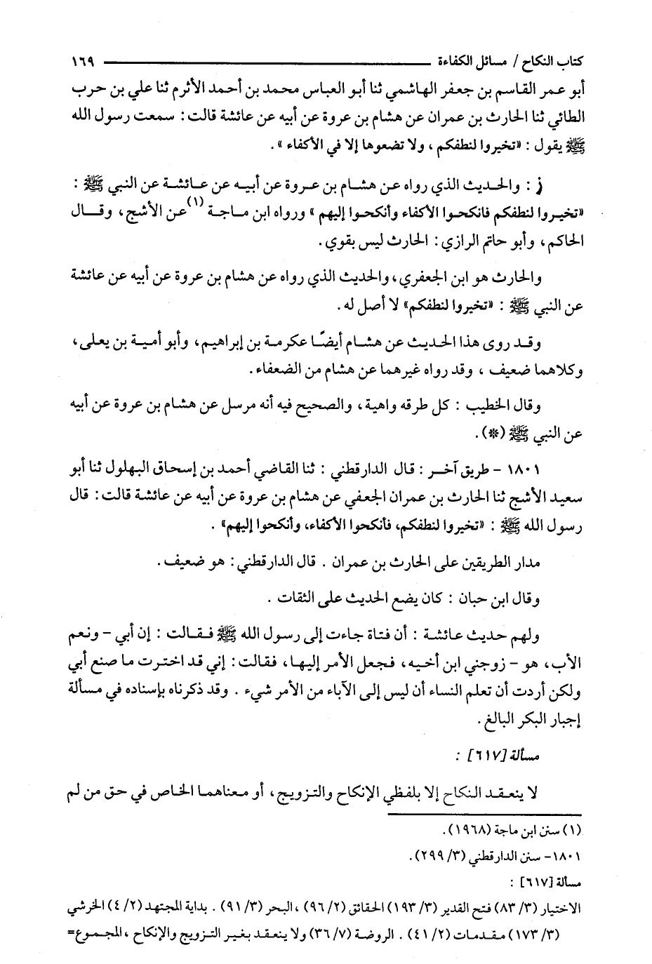 ز : والحديث الذي رواه عن هشام بن عروة عن أبيه عن عائشة عن النبي : ' تخيروا لنطفكم فأنكحوا الأكفاء وأنكحوا إليهم ' ورواه ابن ماجة ( 1 ) عن الأشج ، وقال الحاكم ، وأبو حاتم الرازي : الحارث ليس بقوي .