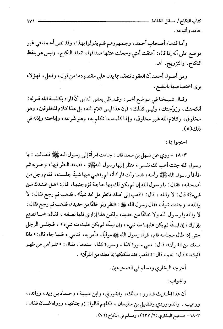 1803 - روي عن سهل بن سعد قال : جاءت امرأة إلى رسول الله فقالت : يا رسول الله جئت أهب لك نفسي ، فنظر إليها رسول الله ، فصعد النظر فيها ، وصوبه ثم طأطأ رسول الله رأسه ، فلما رأت المرأة أنه لم يقضي فيها شيئاً جلست ، فقام رجل من أصحابه ، فقال : يا رسول الله إن لم يكن لك بها حاجة فزوجنيها ، قال : ' هل عندك من شيء ؟ ' قال : لا والله ، قال : ' اذهب إلى أهلك فانظر هل تجد شيئاً ' ، فذهب ثم رجع فقال : لا والله ما وجدت شيئاً : فقال رسول الله : ' انظر ولو خاتماً من حديد ' ، فذهب ثم رجع فقال : لا والله يا رسول الله ولا خاتما من حديد ، ولكن هذا إزاري فلها نصفه ، فقال : ' ما تصنع بإزارك ، إن لبستَه لم يكن عليها منه شيء ، وإن لبستَه لم يكن عليك منه شيء ' ، فجلس الرجل حتى إذا طال مجلسه قام ، فرآه رسول الله مولياً ، فأمر به ، فدعي ، فلما جاء قال : ' ماذا معك من القرآن ' ، قال : معي سورة كذا ، وسورة كذا ، عددها . فقال : ' تقرأهن عن ظهر قلبك ' ، قال : نعم ، قال : ' اذهب فقد ملكتكها بما معك من القرآن ' .