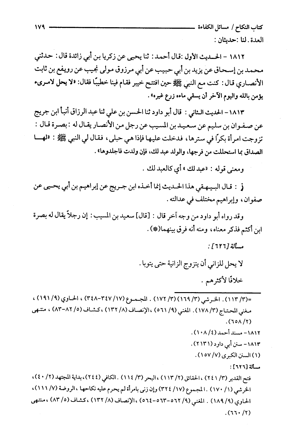1812 - الحديث الأول : قال أحمد : ثنا يحيى عن زكريا بن أبي زائدة قال : حدثني محمد بن إسحاق عن يزيد بن أبي حبيب عن أبي مرزوق مولى نجيب عن رويفع بن ثابت الأنصاري قال : كنت مع النبي حين افتتح خيبر فقام فينا خطيباً فقال : ' لا يحل لامرئ يومن بالله واليوم الآخر أن يسقي ماءه زرع غيره ' .