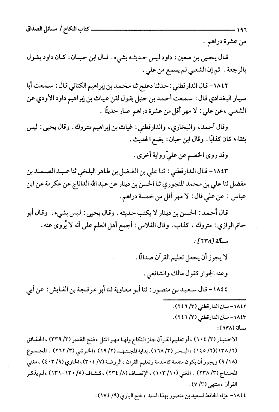 1842 - قال الدارقطني : حدثنا دعلج ثنا محمد بن إبراهيم الكناني قال : سمعت ابا سيار البغدادي قال : سمعت أحمد بن حنبل يقول لقن غياث بن إبراهيم داود الأودي عن على الشعبي ، عن علي : لا مهر أقل من عشرة دراهم صار حديثاً .