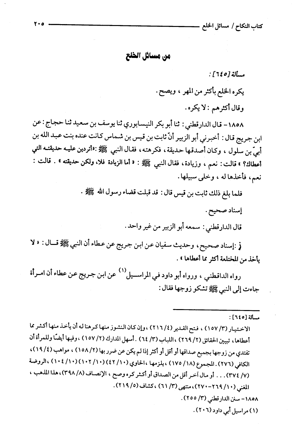 1858 - قال الدارقطني : ثنا أبو بكر النيسابوري ثنا يوسف بن سعيد ثنا حجاج : عن ابن جريج قال : أخبرني أبو الزبير أنّ ثابت بن قيس بن شماس كانت عنده بنت عبد الله بن أبيّ بن سلول ، وكان أصدقها حديقة ، فكرهته ، فقال النبي : ' أتردين عليه حديقته التي أعطاك ؟ ' قالت : نعم ، وزيادة ، فقال النبي : ' أما الزيادة فلا ، ولكن حديقته ' . قالت : نعم ، فأخذها له ، وخلى سبيلها .