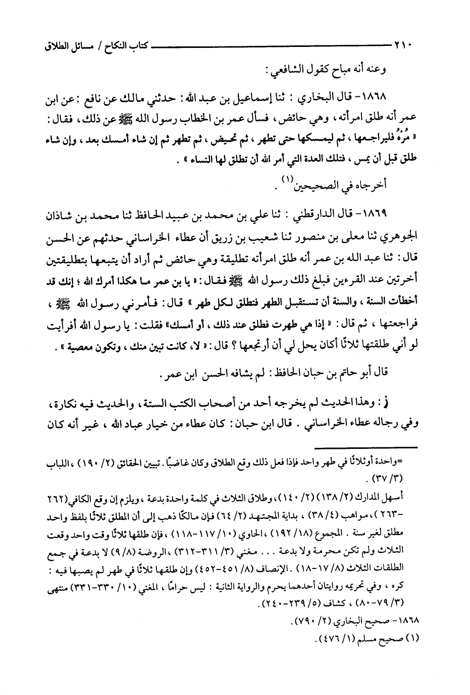 1868 - قال البخاري : ثنا إسماعيل بن عبد الله : حدثني مالك عن نافع : عن ابن عمر أنه طلق امرأته ، وهي حائض ، فسأل عمر بن الخطاب رسول الله عن ذلك ، فقال : ' مُرْهُ فليراجعها ، ثم ليمسكها حتى تطهر ، ثم تحيض ، ثم تطهر ثم إن شاء أمسك بعد ، وإن شاء طلق قبل أن يمس ، فتلك العدة التي أمر الله أن تطلق لها النساء ' .