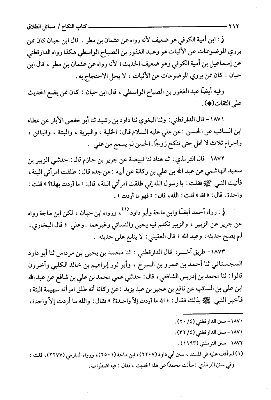 1873 - طريق آخر : قال الدارقطني : ثنا محمد بن يحيى بن مرداس ثنا أبو داود السجستاني ثنا أحمد بن عمرو بن السرح ، وأبو ثور إبراهيم بن خالد الكلبي وأخرون قالوا : ثنا محمد بن إدريس الشافعي ، قال : حدثني عمي محمد بن علي بن شافع عن عبد الله ابن علي بن السائب عن نافع بن عجير بن عبد يزيد : عن ركانة أنه طلق امرأته سهيمة البتة ، فأخبر النبي بذلك فقال : ' الله ما أردت إلاّ واحدة ؟ ' فقال : والله ما أردت إلاّ واحدة ،