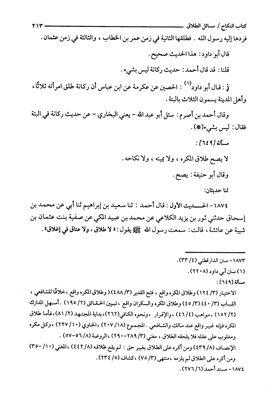 1874 - الحديث الأول : قال أحمد : ثنا سعيد بن إبراهيم ثنا أبي عن محمد بن إسحاق حدثني ثور بن يزيد الكلاعي عن محمد بن عبيد المكي عن صفية بنت عثمان بن شيبة عن عائشة ، قالت : سمعت رسول الله يقول : ' لا طلاق ، ولا عتاق في إغلاق ' .