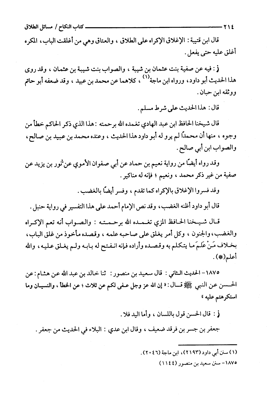 1875 - الحديث الثاني : قال سعيد بن منصور : ثنا خالد بن عبد الله عن هشام : عن الحسن عن النبي قال : ' إن الله عز وجل عفى لكم عن ثلاث ؛ عن خطأ ، والنسيان وما استكرهتم عليه ' .