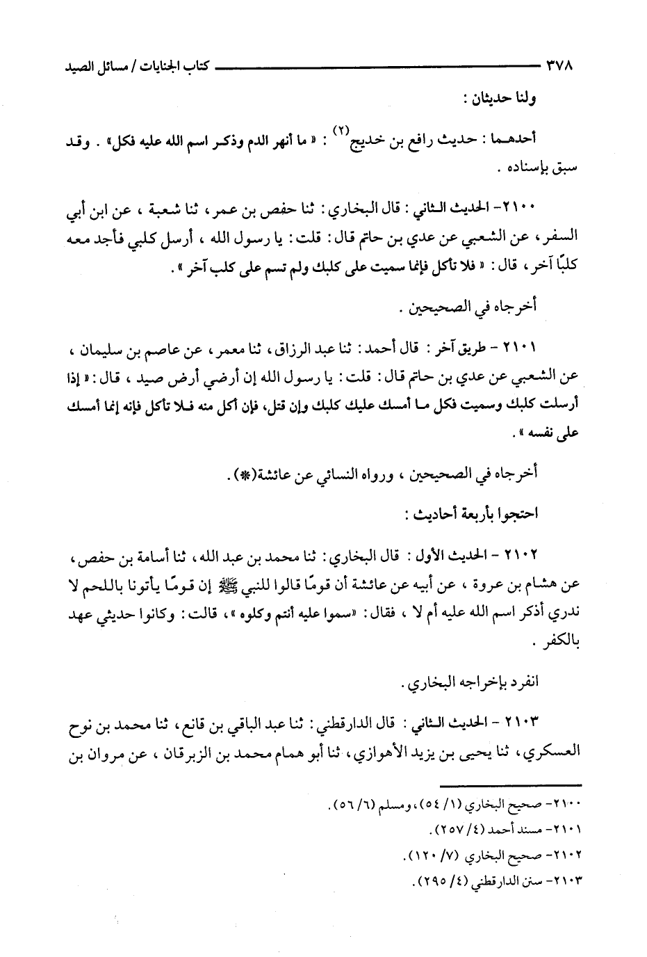 2100 - الحديث الثاني : قال البخاري : ثنا حفص بن عمر ، ثنا شعبة ، عن ابن أبي السفر ، عن الشعبي عن عدي بن حاتم قال : قلت : يا رسول الله ، أرسل كلبي فأجد معه كلباً آخر ، قال : ' فلا تأكل فإنما سميت على كلبك ولم تسم على كلب آخر ' .