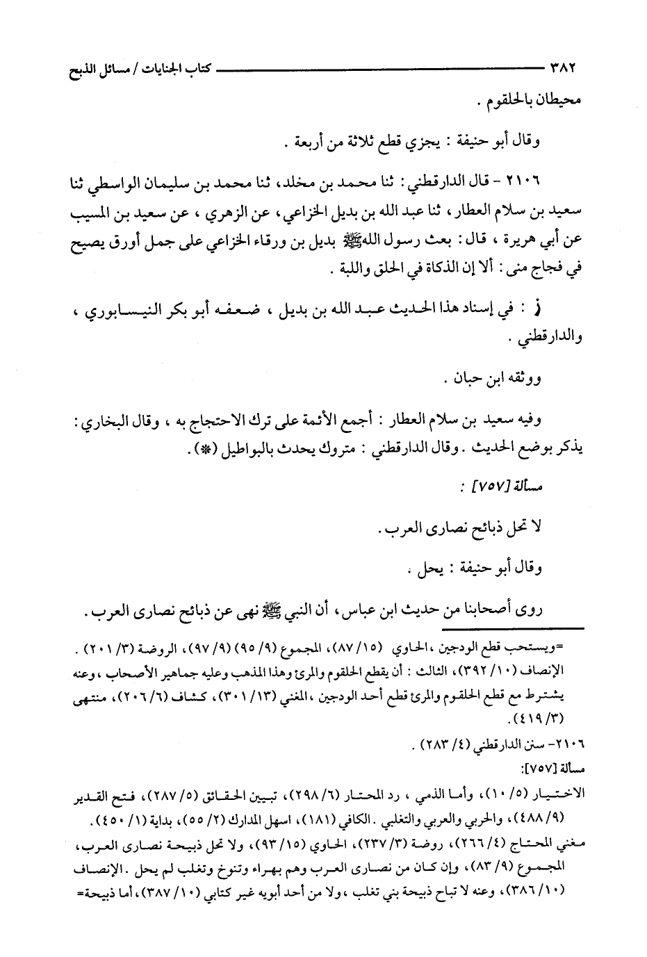 2106 - قال الدارقطني : ثنا محمد بن مخلد ، ثنا محمد بن سليمان الواسطي ثنا سعيد بن سلام العطار ، ثنا عبد الله بن بديل الخزاعي ، عن الزهري ، عن سعيد بن المسيب عن أبي هريرة ، قال : بعث رسول الله بديل بن ورقاء الخزاعي على جمل أورق يصيح في فجاج منى : ألا إن الذكاة في الحلق واللبة .